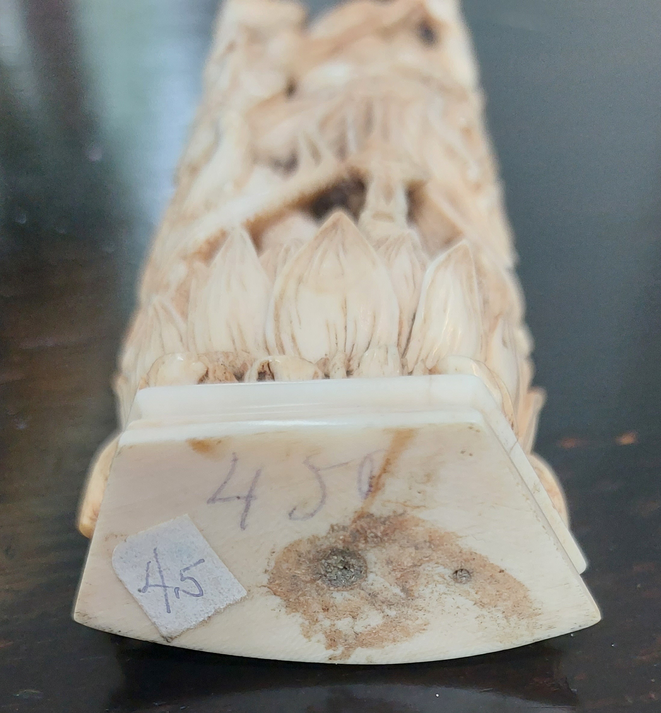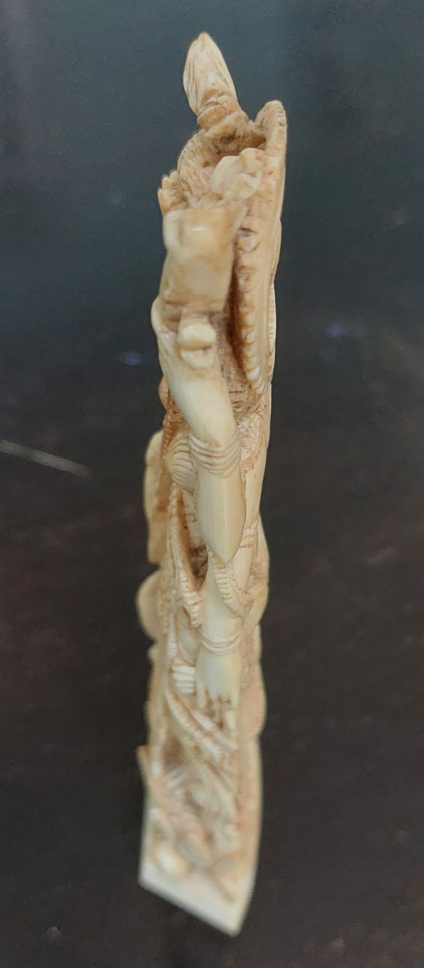 The carving measures 7in high and is very detailed. The discoloration makes me wonder if it is truly ivory, or was intentionally made to look that way. I have not cleaned it since I don't know what it is, so some of the discoloration may actually come off when cleaned. The piece is extremely thin in depth, almost like the overall piece is blade shaped.