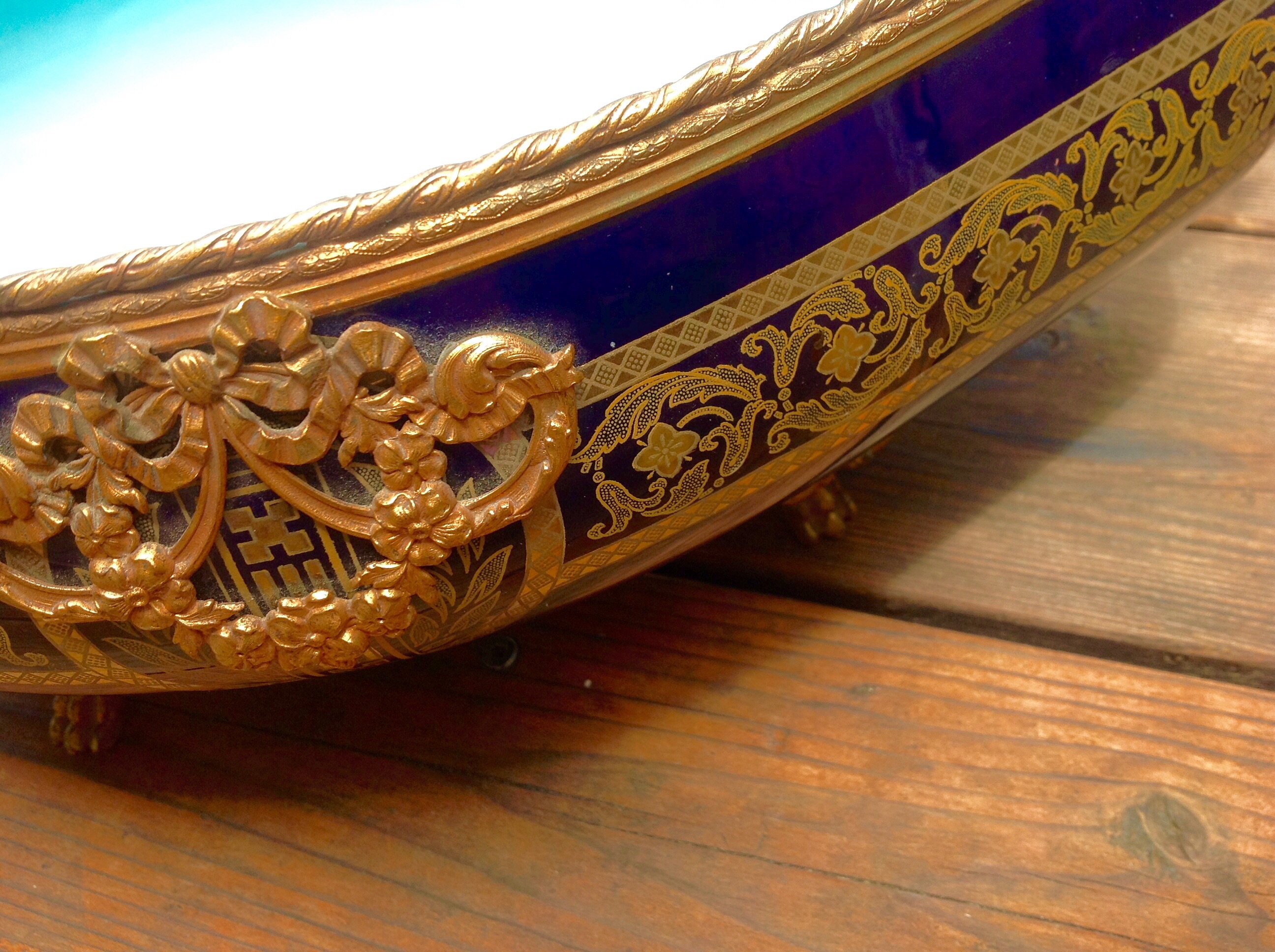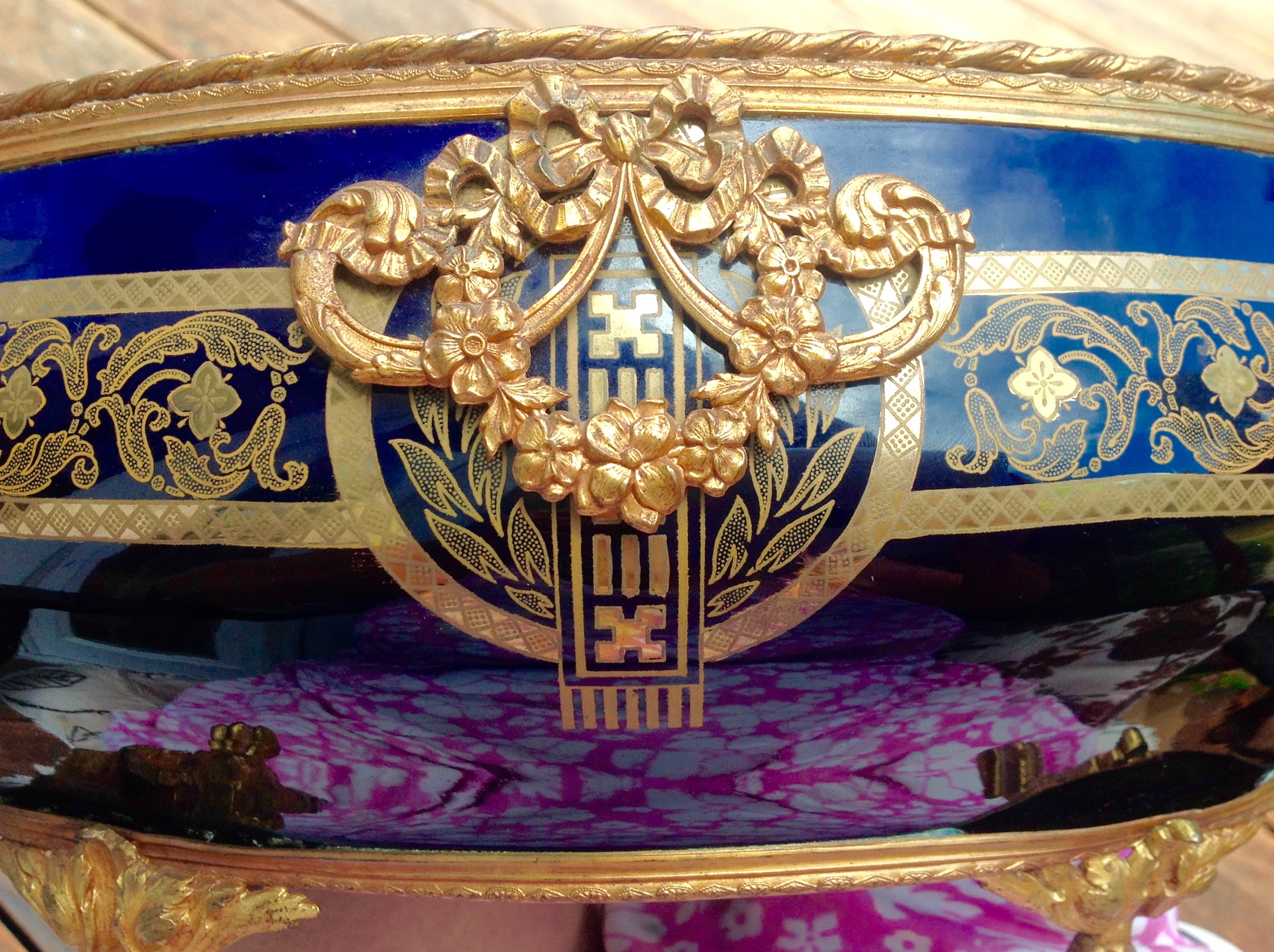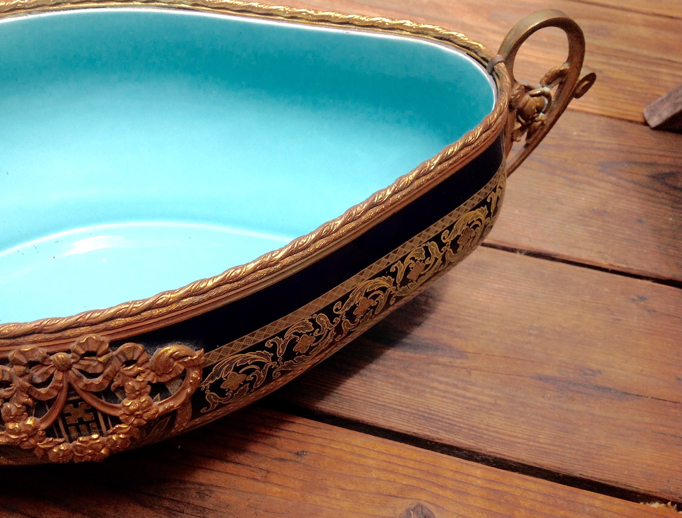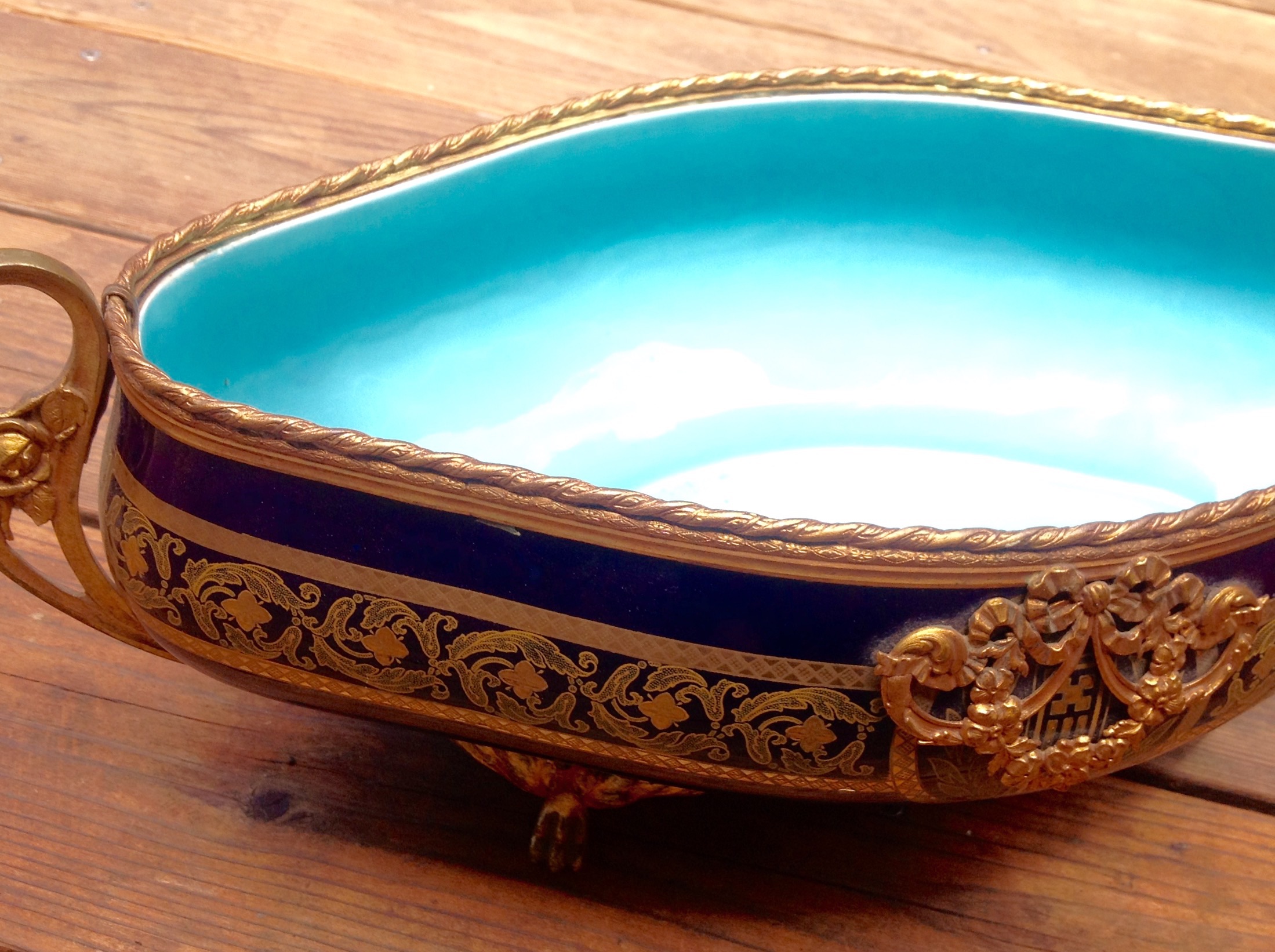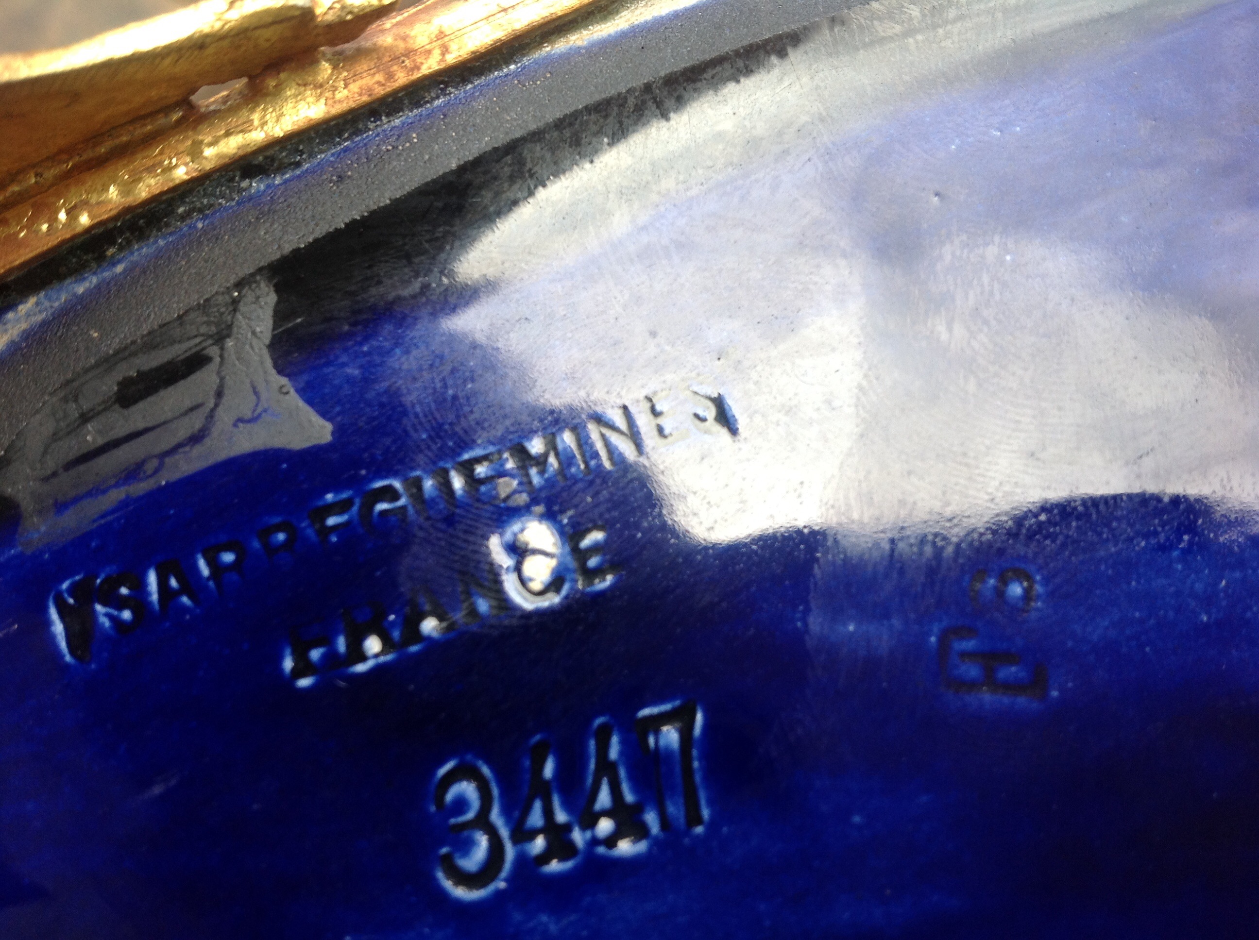 Impression stamped sarrfguemines in glaze, Also says Dec 2251. 4 pretty claw feet. Turquoise blue on the inside and cobalt with gold accents on outside plus metal handles and embellishment.