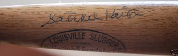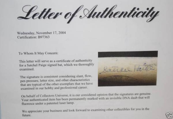 In 1973, Satchel Paige was a guest at Leo Cloutier's Annual New Hampshire baseball dinner. The autograph was obtained there. I have searched online to try and find another baseball bat signed by Satchel Paige, but have had no luck. Haven't found any full size, let alone any mini bats autographed by him. I know that I have seen many single signed basballs that sell for about a grand. Just curious what this unique item may bring in. Signature has been authenticated by PSA, so it is authentic.