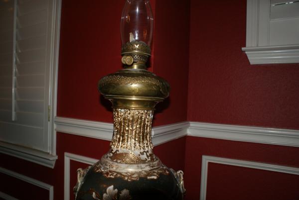 Satsuma Vase Lamp. 2 wick Kerosene lamp. Has a brass base and top adorned with dragon pattern. No markings. Purchased in an estate sale.