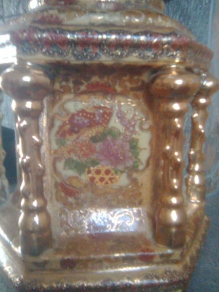 It's a satsuma vase (China) that is beautiful, very detailed, gold and looks to be hand painted porcelain. Peacocks and flowers, painted in red, cream, white, black and then the gold.