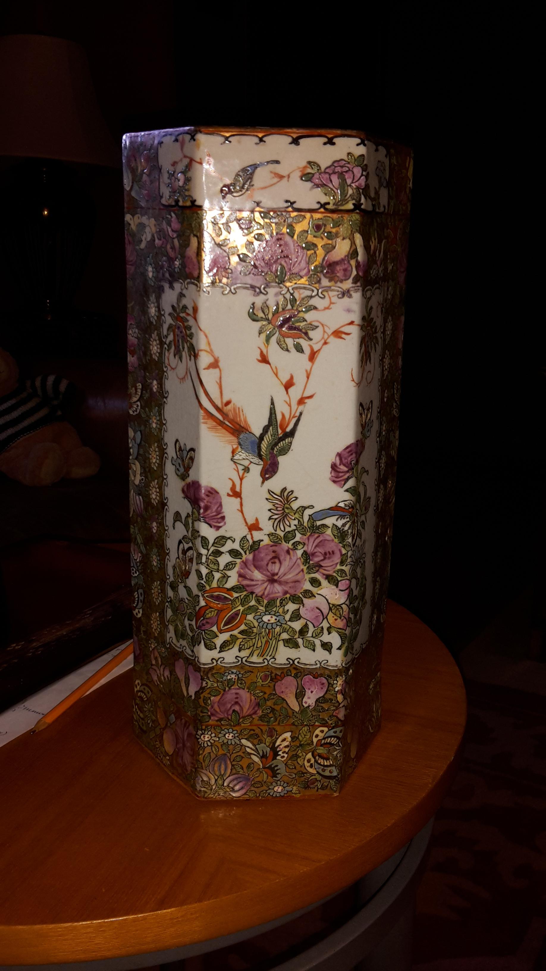 Beautiful vase with peacocks and geisha and gold trim.
