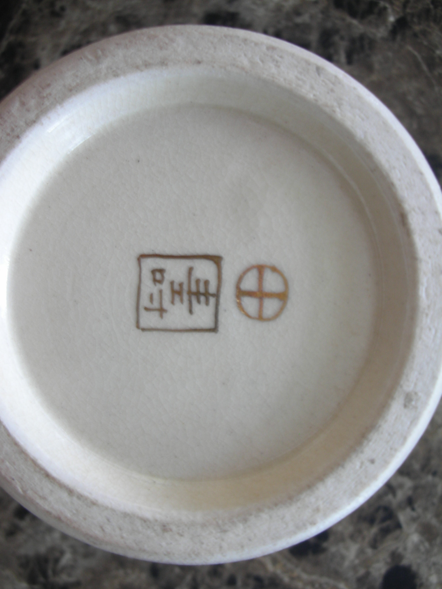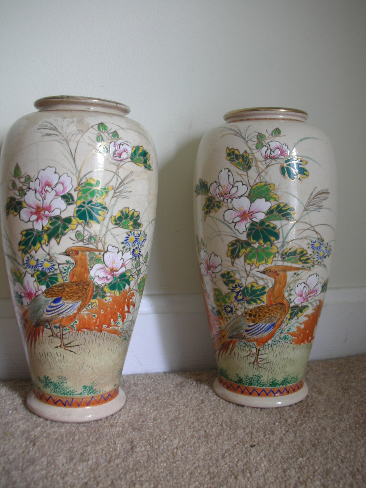 A friend gave me these vases. From what I found on the internet I think they are Satsuma Vases. The vases each have the same markings on the bottom, a circle with a cross thru it and Japanese Kangi. I have read that the circle with the cross going thru it means they are authentic, not reproductions. I can't find the Japanese Kangi and so can't identify it further. One vase is cracked and looks like it has been glued, the other vase is not. On the insides it looks like there are water lines as if used for flowers. I don't know any history about the vases. Can you tell me what they are and how much they are worth?
