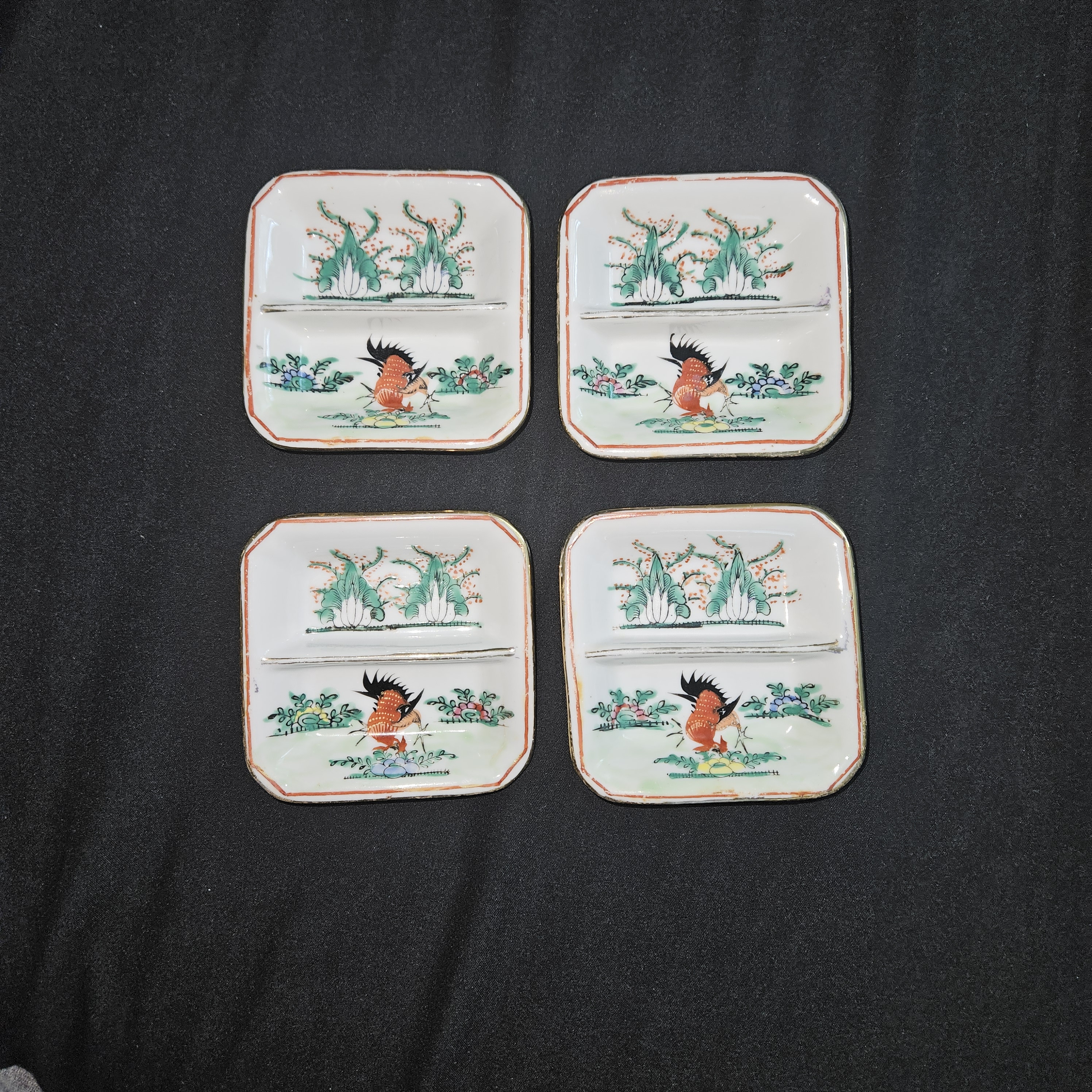 This set of sauce dishes is crafted from ceramic, featuring a classic rectangular shape with two compartments. The dishes are decorated with colorful floral and bird motifs, primarily in green, red, and blue tones. The dimensions are not provided, but they typically range from 6 to 8 inches in length for similar pieces. The dishes are finished with a gold trim along the edges, enhancing their aesthetic appeal.