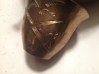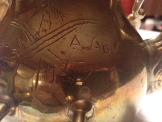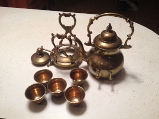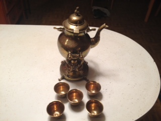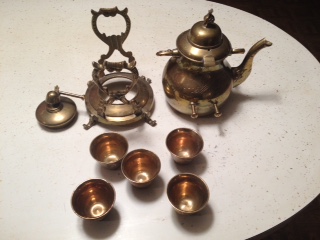 Saudi Arabian Tea Pot with wick oil burned, five cups and stand, has crossed swords wit Saudi Arabia hand written ( Arabia is misspelled ) and what loos like palm trees on other side, cups has same floral designs. I've found one like it on line but it ; Saudi Arabia was professionally ingraved, this one is hand written.
