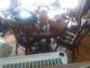 Maple Windsor table with 4 chairs and 2 Leaves. Manufactures original paper label and burned mark. Patina evident on the original cherry colored finish. Structurally complete though may benefit from reconditioning. Will not be sold in pieces.