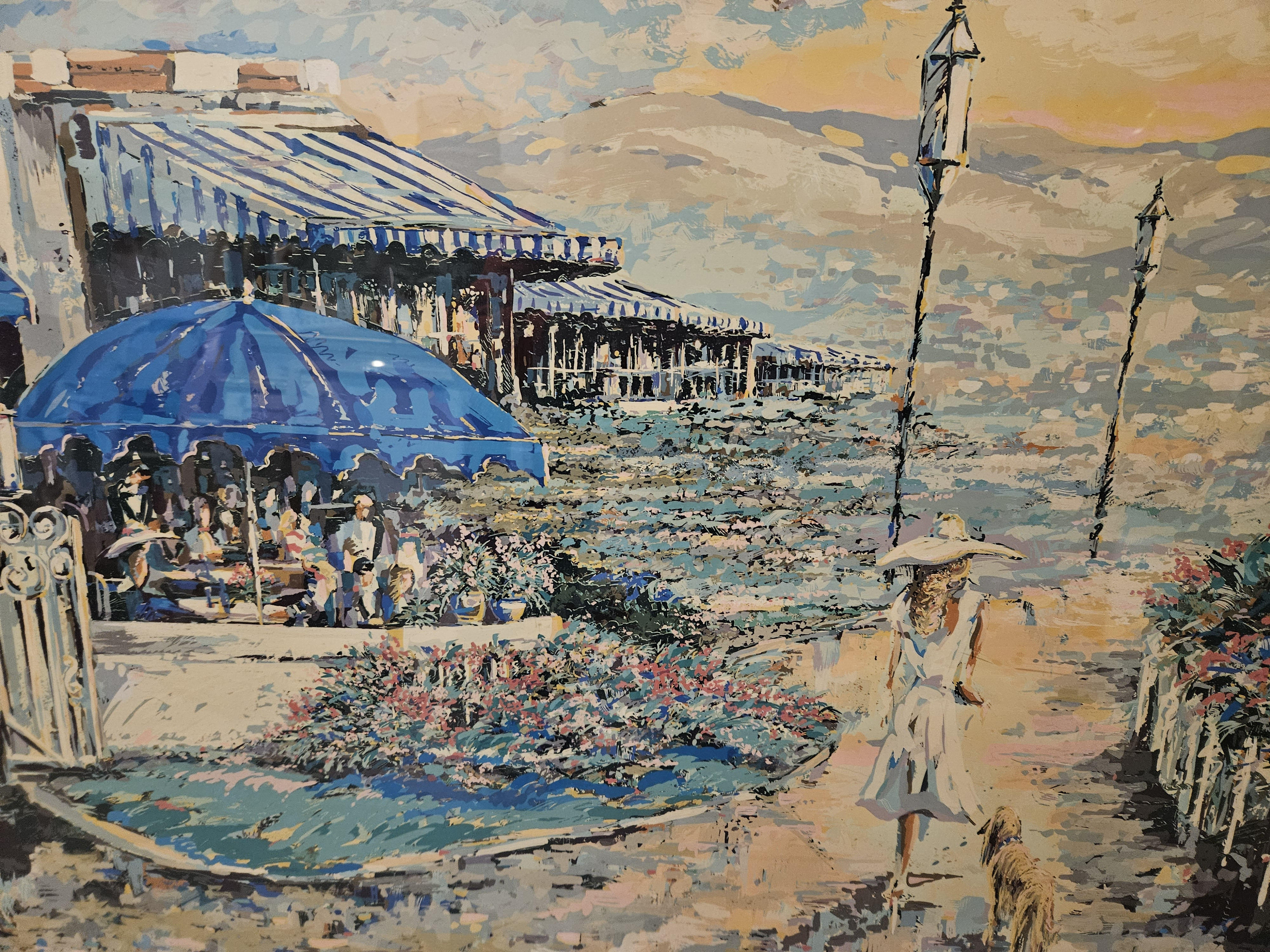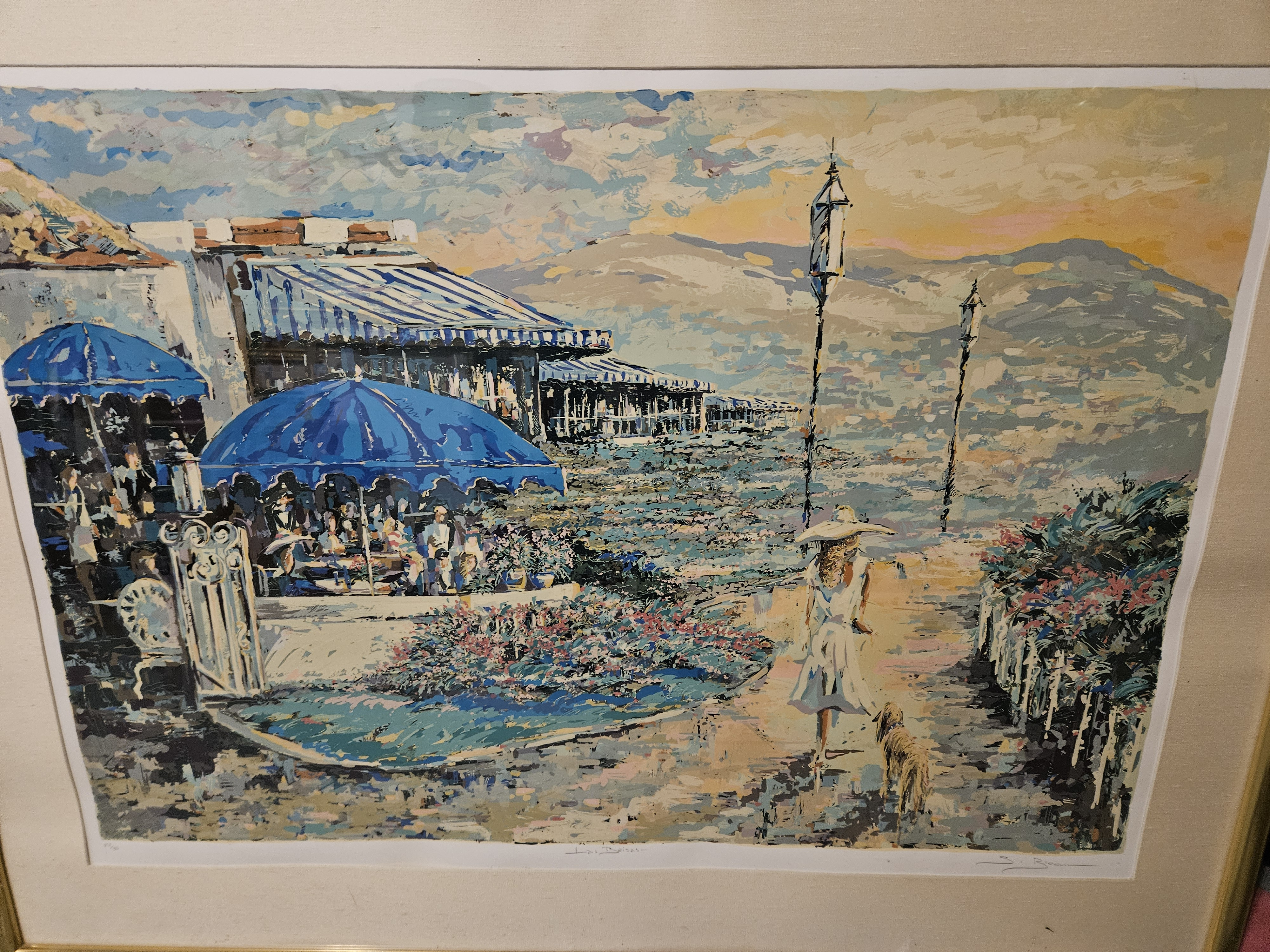 This is a signed and numbered print by S. Bloom, measuring 39x27 inches and housed in a gold frame. The edition number is 252/325, indicating it is part of a limited edition series. The artwork features an impressionistic-style depiction of a resort-like setting with blue awnings, a woman walking a dog, and mountains in the background. The condition is excellent