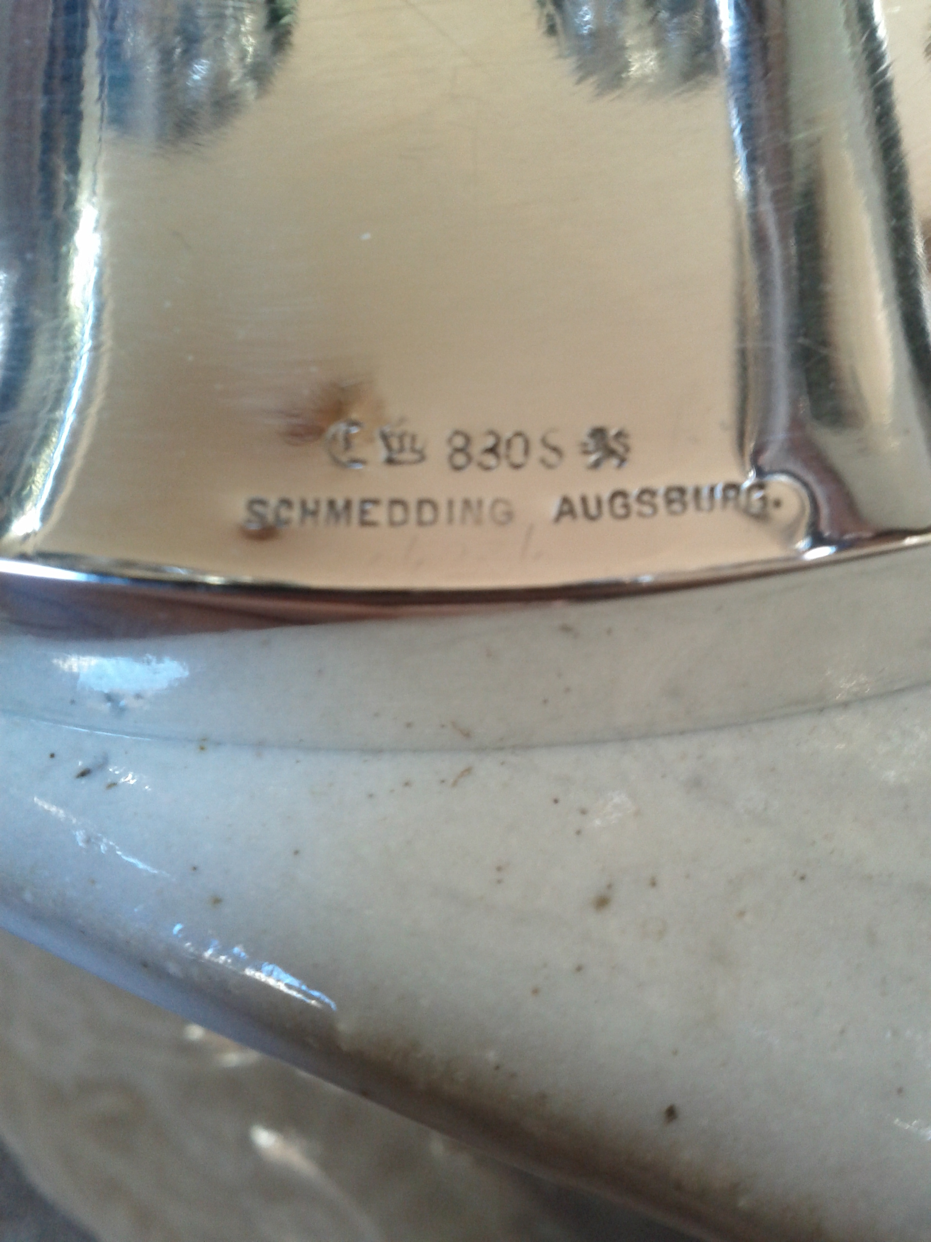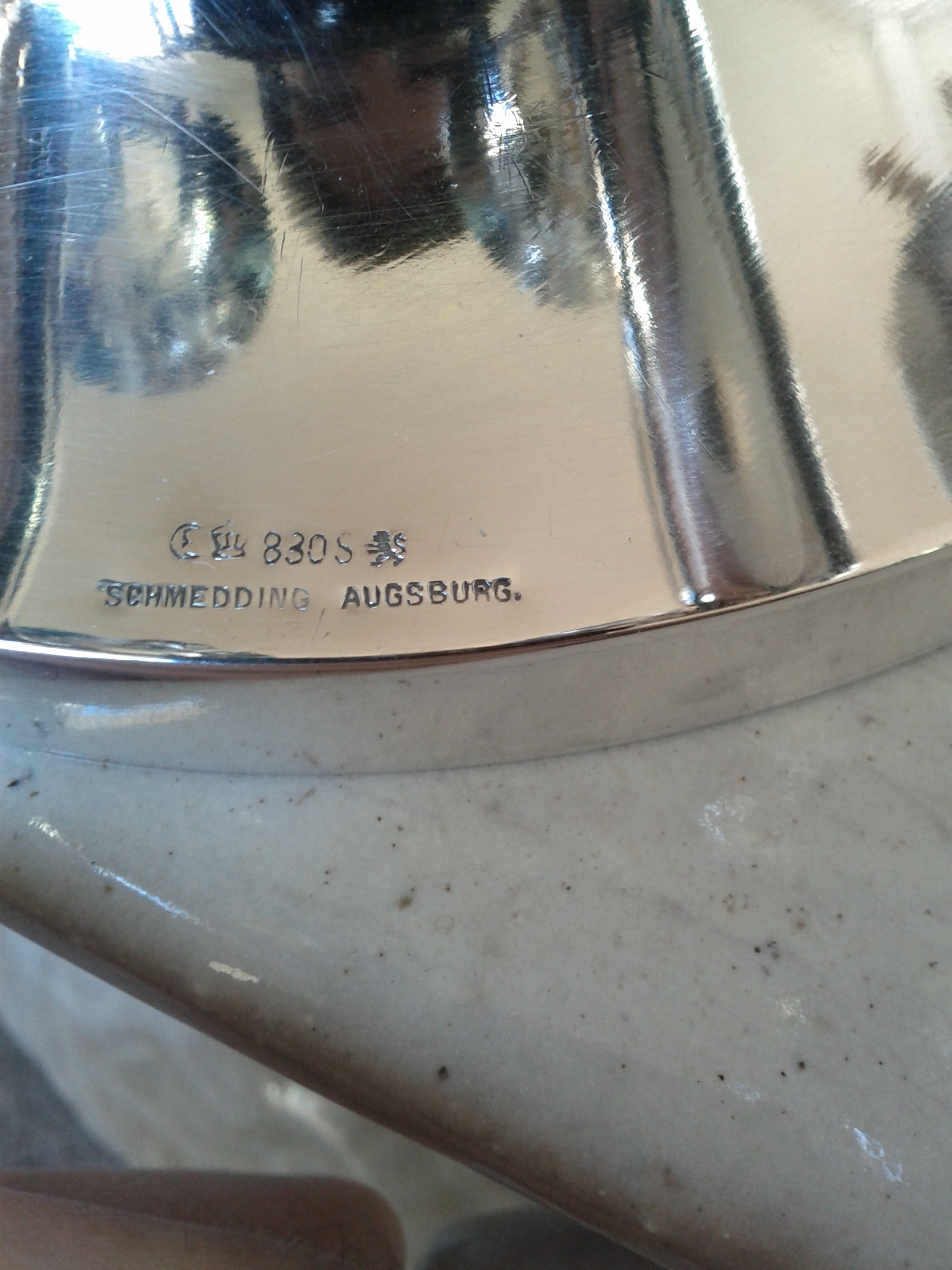 Howdy, inherited from my Grandparents is a very unusual "horn" style (?) 6 light candelabra of sterling silver. lights are in a circle with a finial in the middle of piece. Marked "Schmedding Augsburg" hallmark has crescent, crown, and prancing lion with 830S all stamped on exterior rim of base.