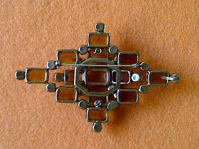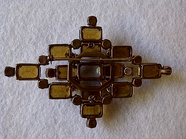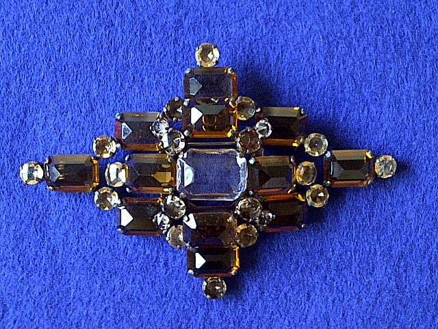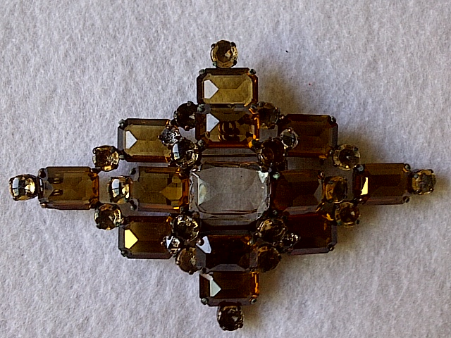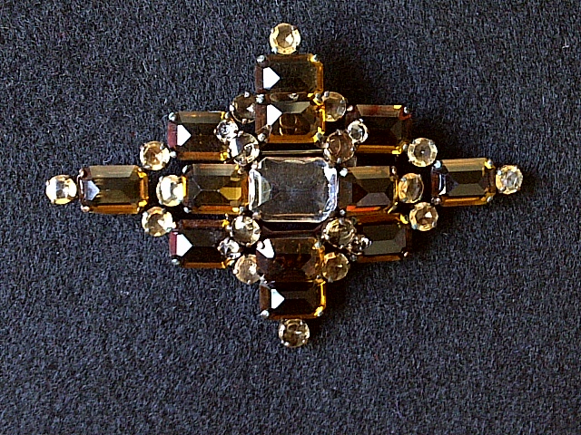 I found this lovely and most decadent costume brooch in a charity shop. It is hallmarked Schreiner New York on a small button on the back of the brooch, It is 4 inches wide and 3 inches high with a large clear center stone. Topaz colored, foil back cabs(reverse facets) and more round cut clear colored tones adorn this piece. I have read about the Schreiner company and have seen other lovely works, but none yet as decadent as this. Thank you in advance.