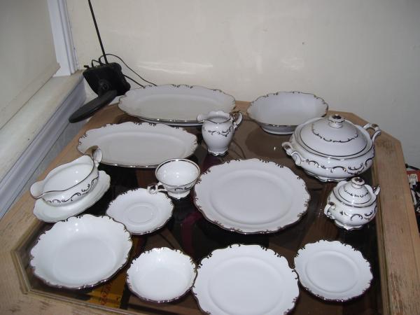 12 of each place setting, 3 serving platers small medium and large, a gravy server, cream and sugar servers, and a server bowl with cover