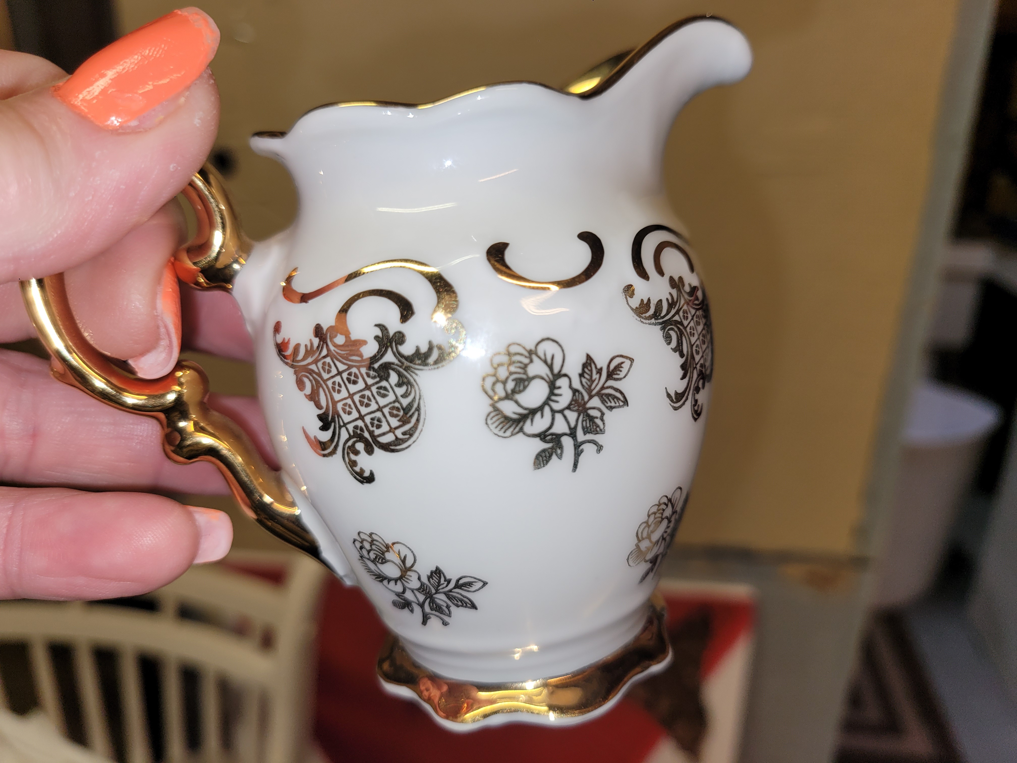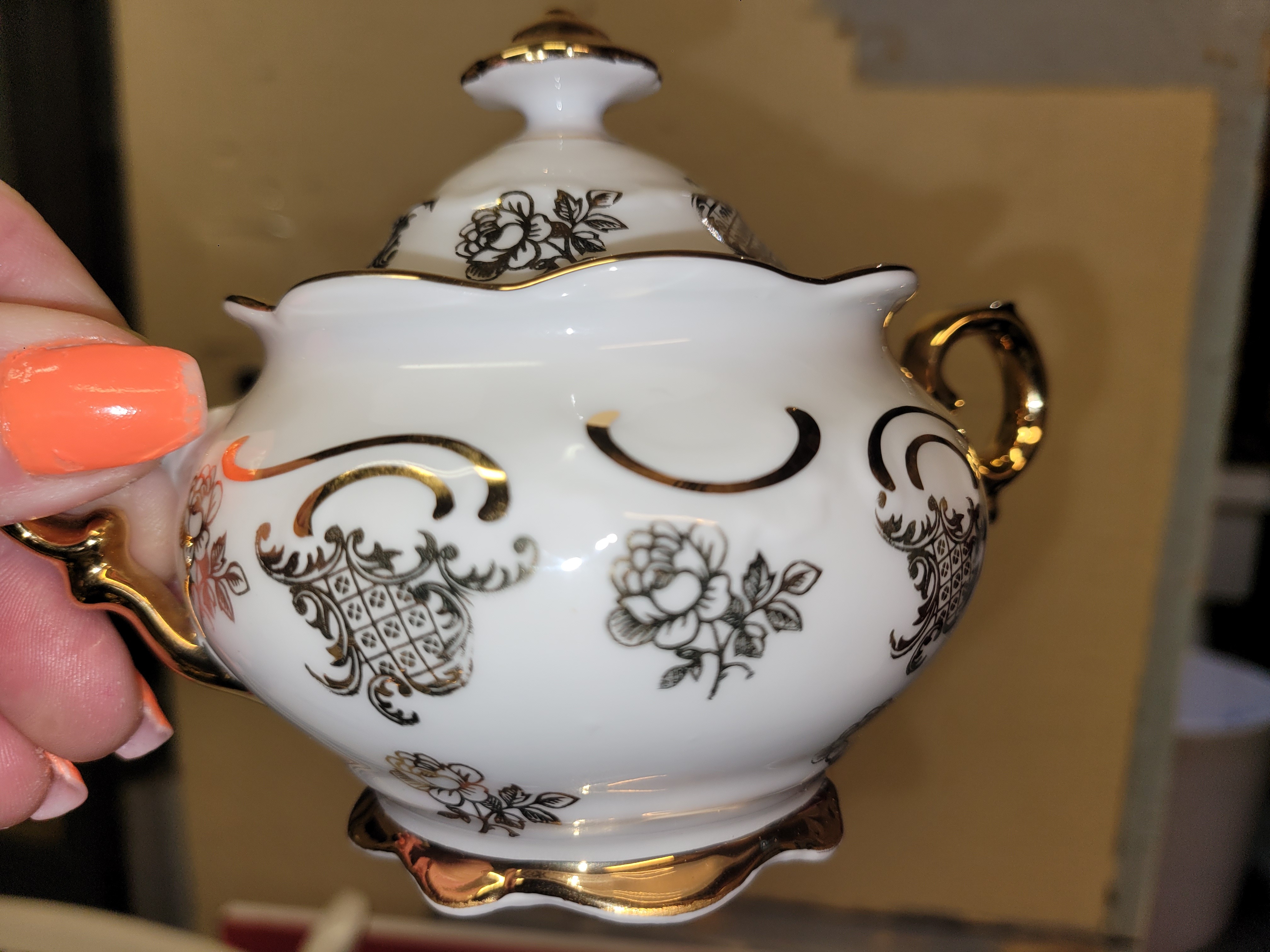 Physical Description: This set features fine porcelain with a white base and intricate gold and black floral designs. The gold trim adds an elegant touch. The set includes a teapot, creamer, sugar bowl, and several cups and saucers. The teapot has a rounded body with a decorative lid, while the cups are adorned with a gold interior. The dimensions of the teapot are approximately 8 inches tall and 6 inches wide, while the cups are about 3 inches tall and 4 inches wide.