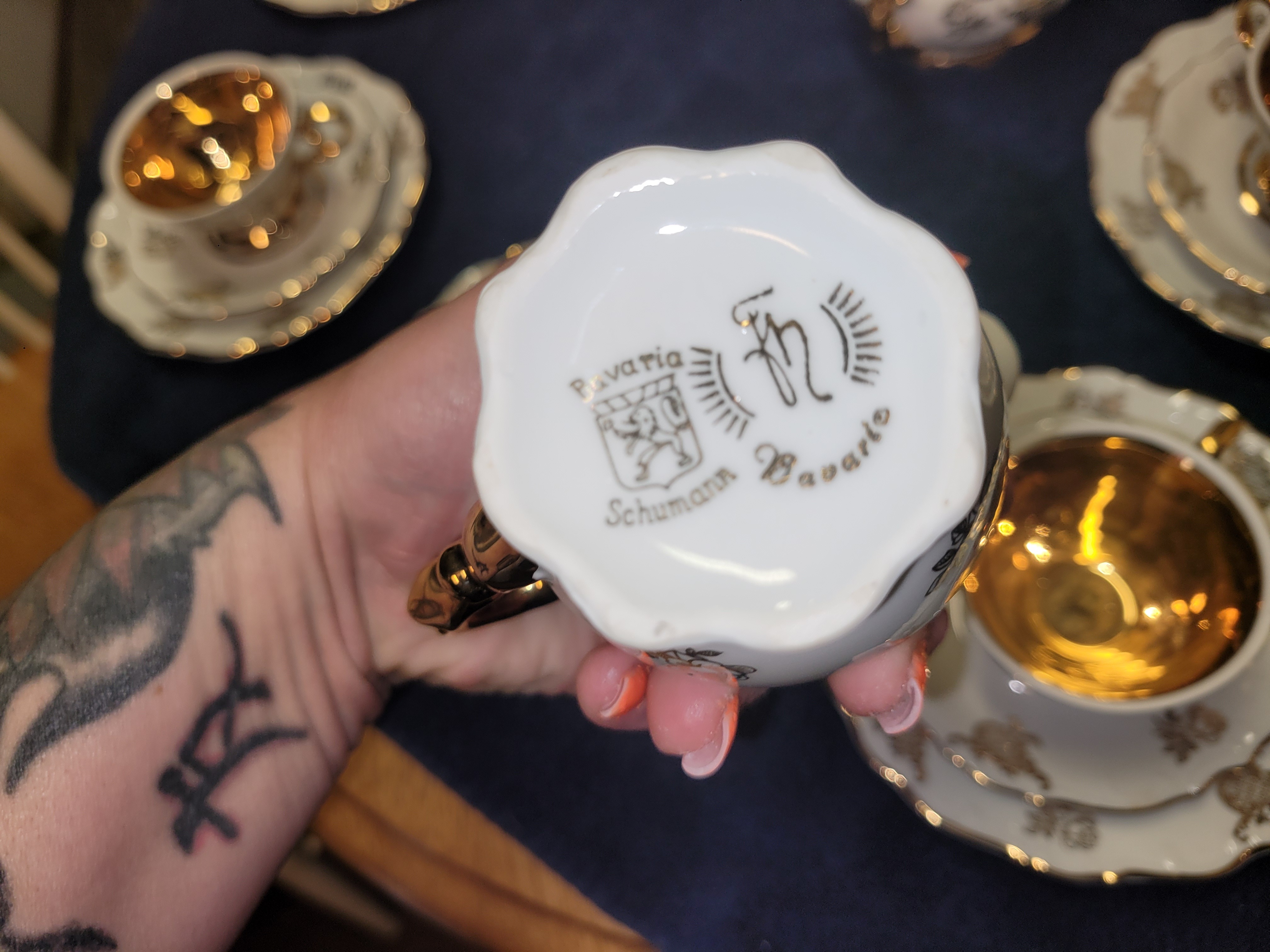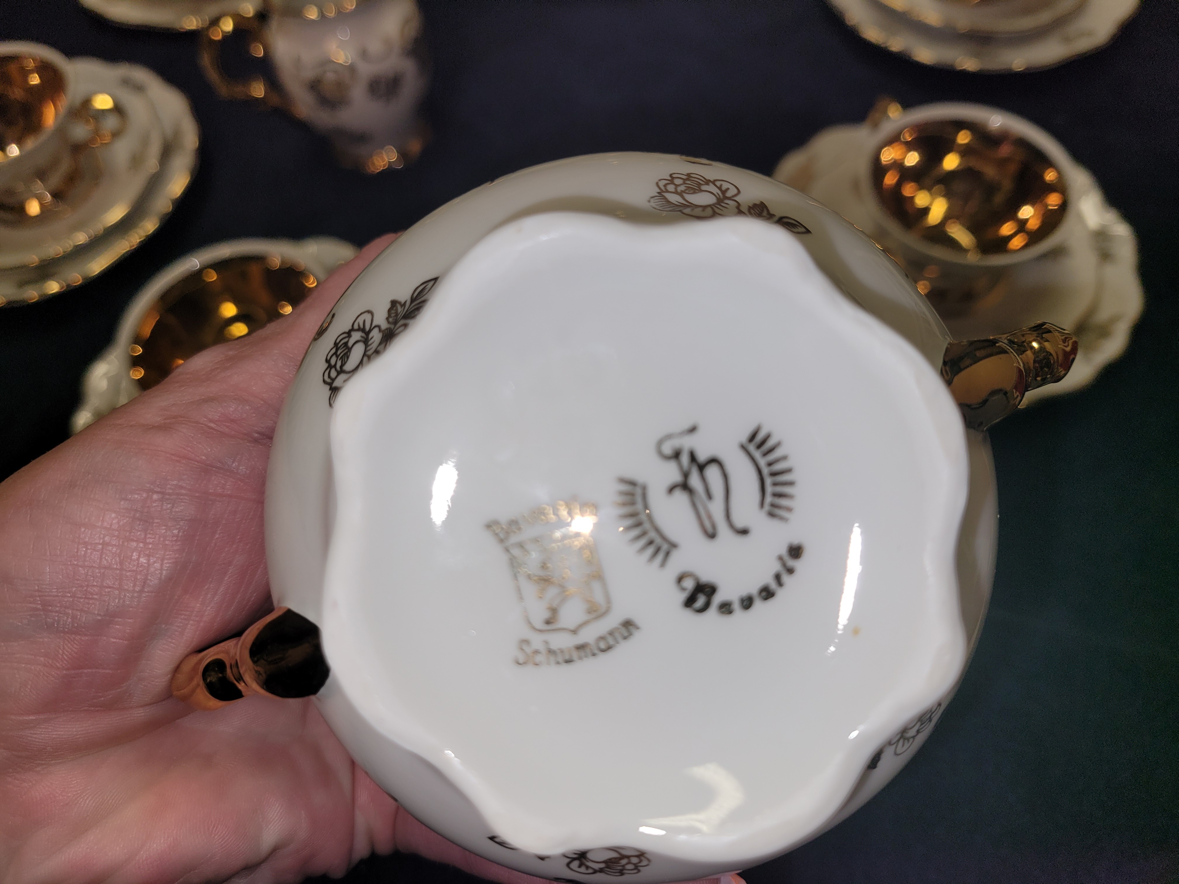 The maker is Schumann, a renowned porcelain manufacturer based in Arzburg, Bavaria, Germany. Founded in the early 20th century, Schumann is known for its high-quality china and intricate hand-painted designs. The specific mark on this set, featuring a gold lion, indicates production from the 1930s to 1940s, aligning with the historical context of post-war Germany.
