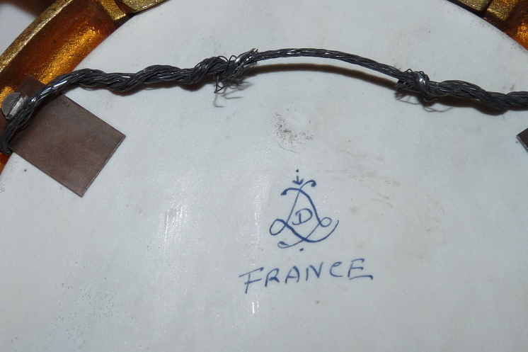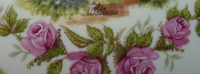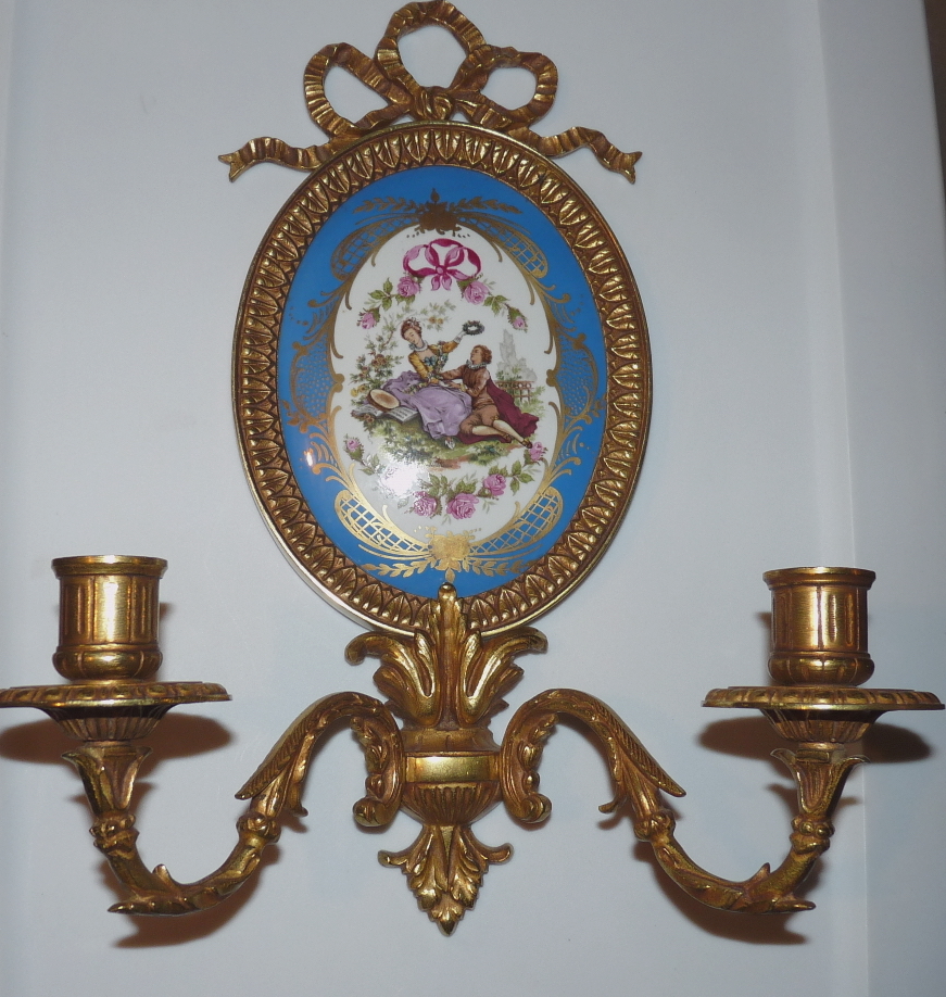 sconce with porcelain plaque, hand painted and signed Watteau. mark on plaque and on metal sconce, I don't know either one. from france, 14" long and candles measure 11" wide. plaque measures 5.2" x 7". i have two that are both different.