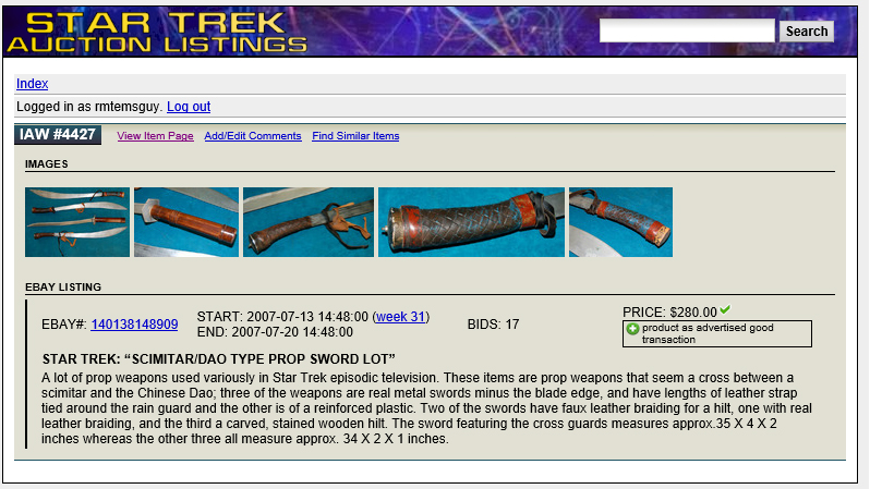 The sword originated from a sale by It’s A Wrap!, a production auction house specializing in official Star Trek memorabilia. The auction series followed the 2006 40 Years of Star Trek: The Collection auction held by Christie’s. Lot #4427 contained four swords used in various Star Trek productions. This sword has been matched to photos from the original sale, verifying its authenticity and screen use.