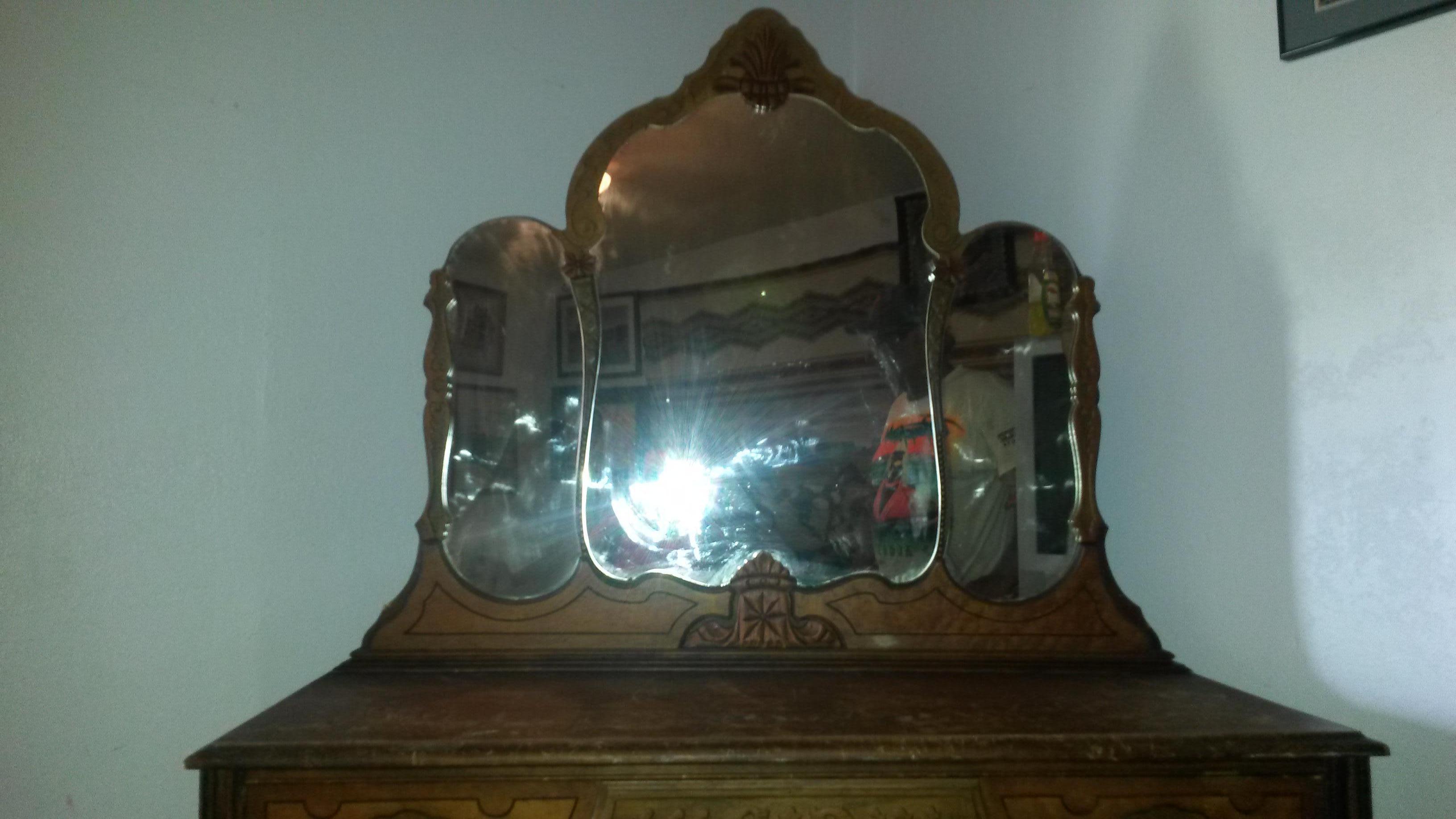 Wooden dresser with 3 mirrors. Beautiful scroll work on dresser and mirror. Mirror is divided into 3 sections. Marking on back of dresser says Hunter Furniture.