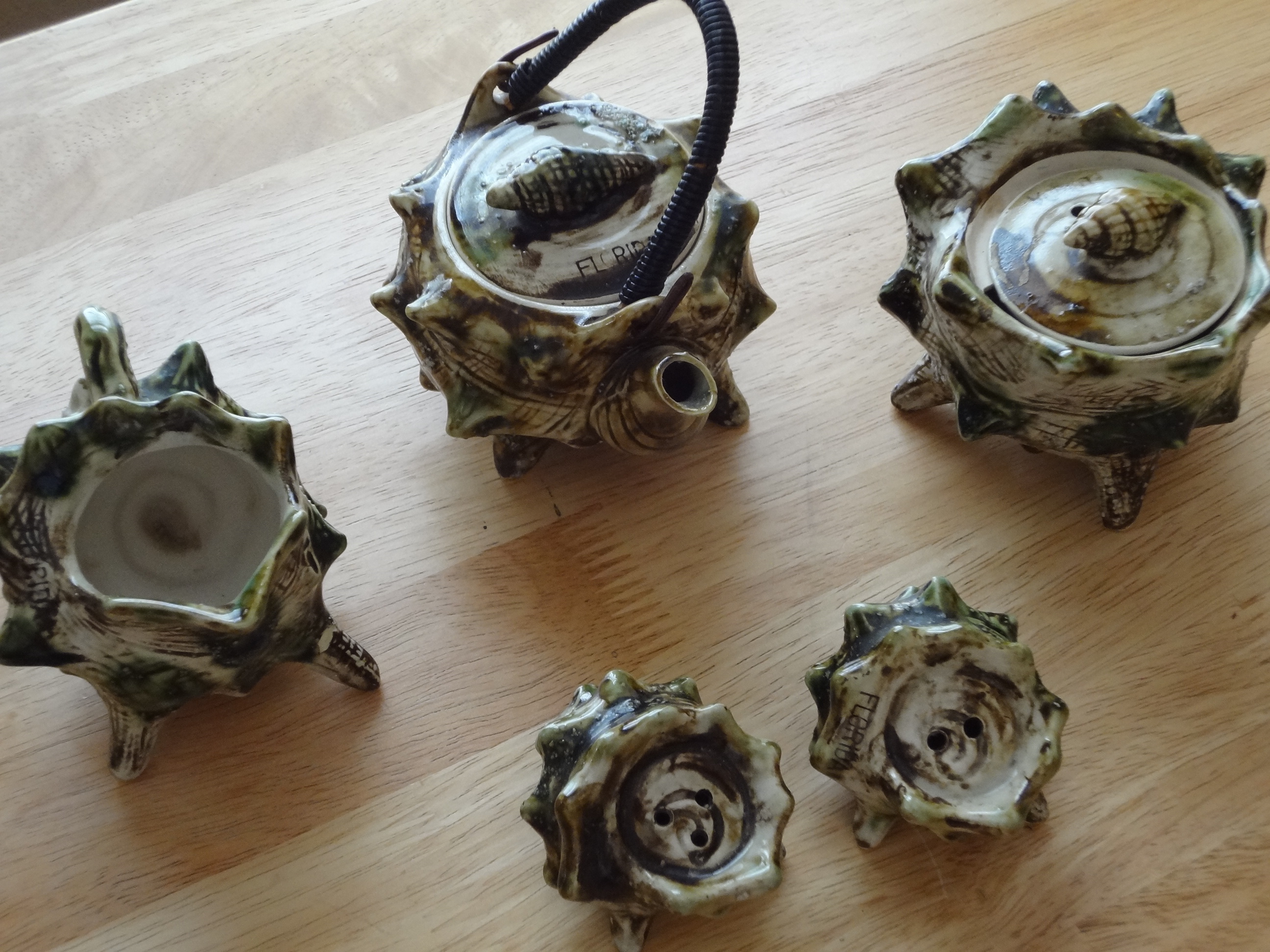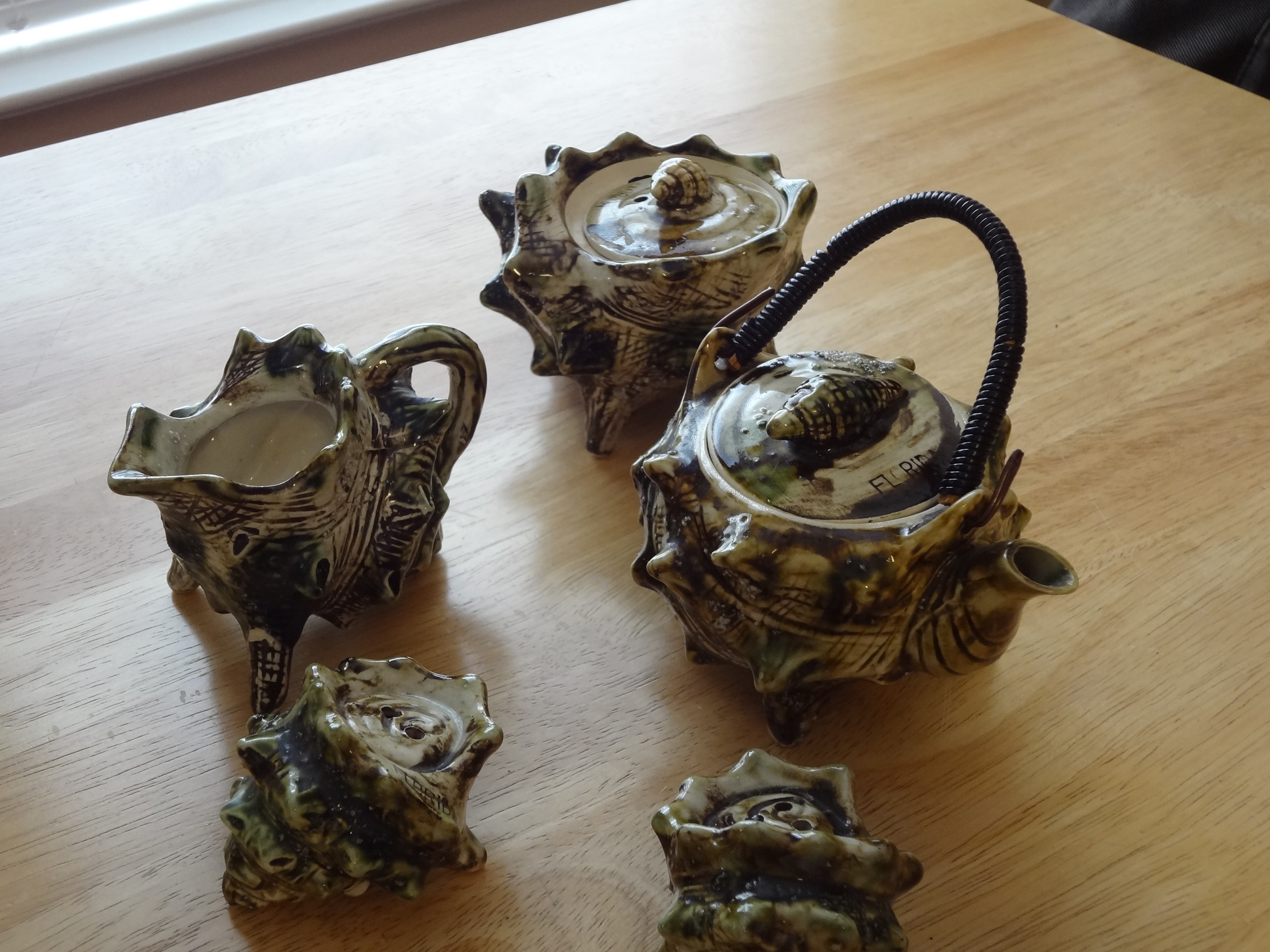 This is a set includes a teapot, cream and sugar containers as well as salt and