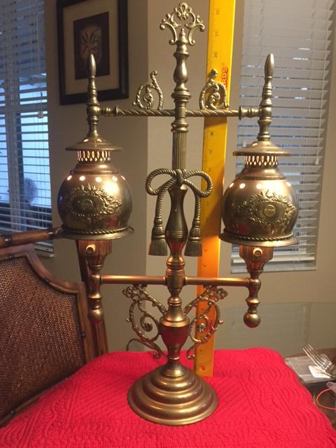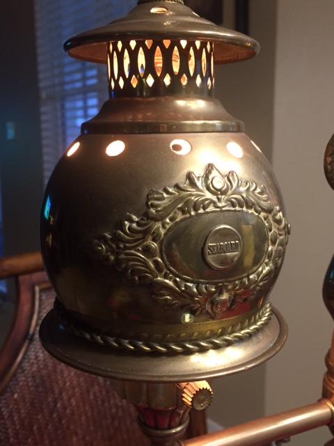 The overall height of the lamp is 22 inches with a total weight of 12.8 lbs. Made entirely of brass (perhaps some copper components), with the exception of three steel threaded tubes which provide the substructure for the brass components. Major elements of the lamp are either soldered, such as the decorations and tubing ends, or threaded such as the main structure assemblies. All major component parts are machine threaded and screwed together.