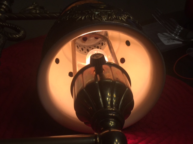 Other info. A local railroad historian inspected the lamp and stated that it did not appear to be a mass produced railroad car lamp in that it was too difficult to change the bulb. Significant disassembly is required to change the bulbs. Moreover, he stated the base was too small for rolling stock use, because it would not provide sufficient stability for the lamp. He stated he had never seen such a lamp before and suggested it may have been a handmade executive or executive retirement gift.