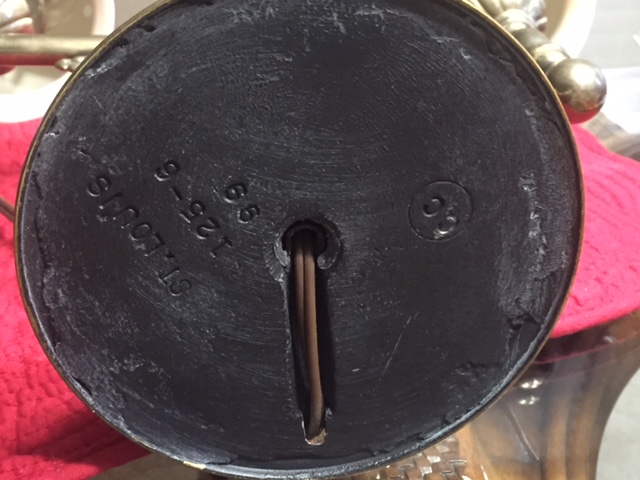 The largest and heaviest competent is the base. Filled with pored lead and painted black with a race for the electric cord. Stamped on the bottom of the into the lead material are the letters, "ST LOUIS", which are block letter but not in a straight line, suggesting they were individually stamped. Below that are the numbers' "125-6", and below that is the number "99". Further down is a manufacturer or craftsman stamped logo, a circle surrounding the letters. "CC"