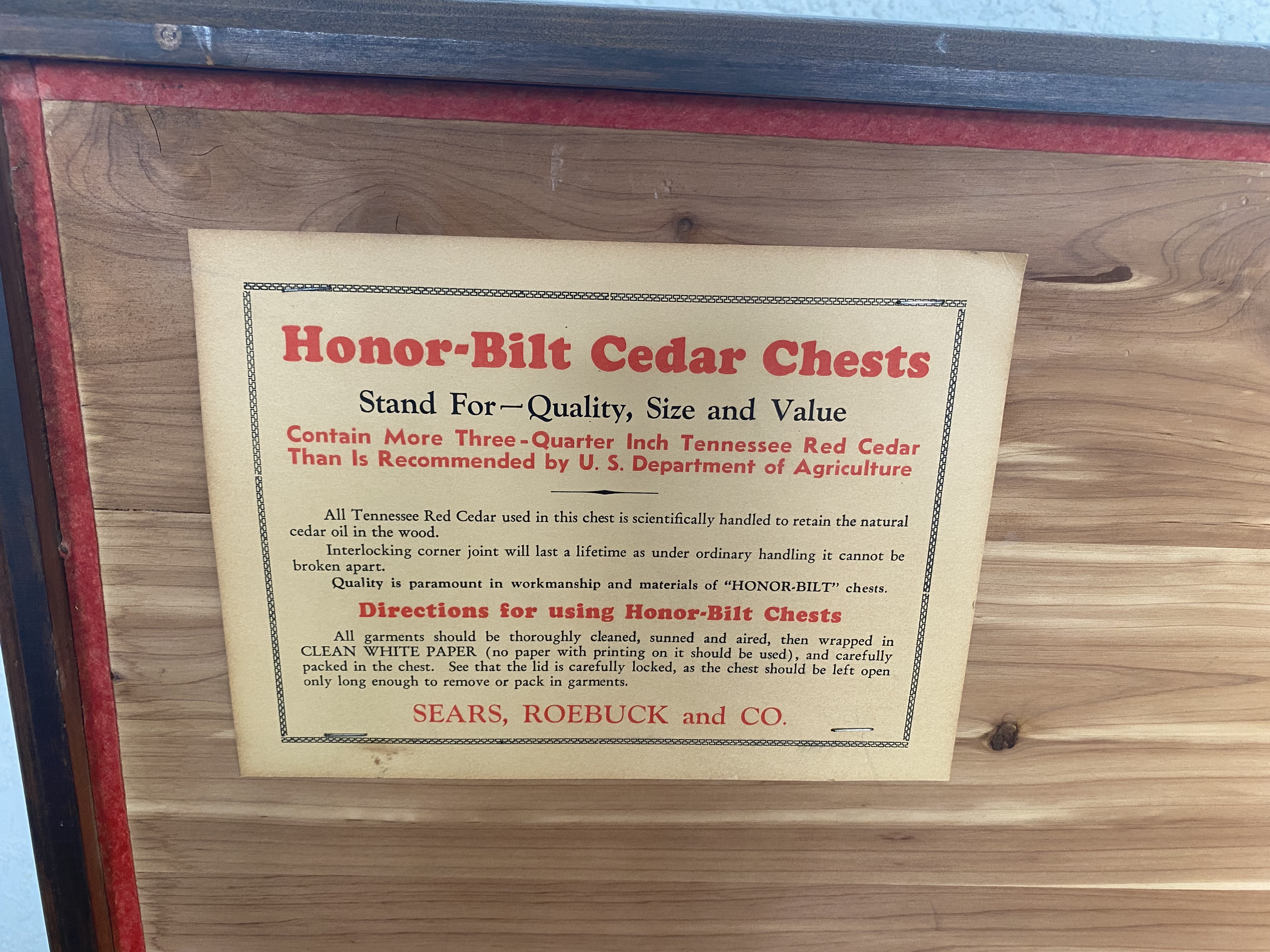 1930-1940 Sears Roebuck Tennessee red cedar chest in good condition.