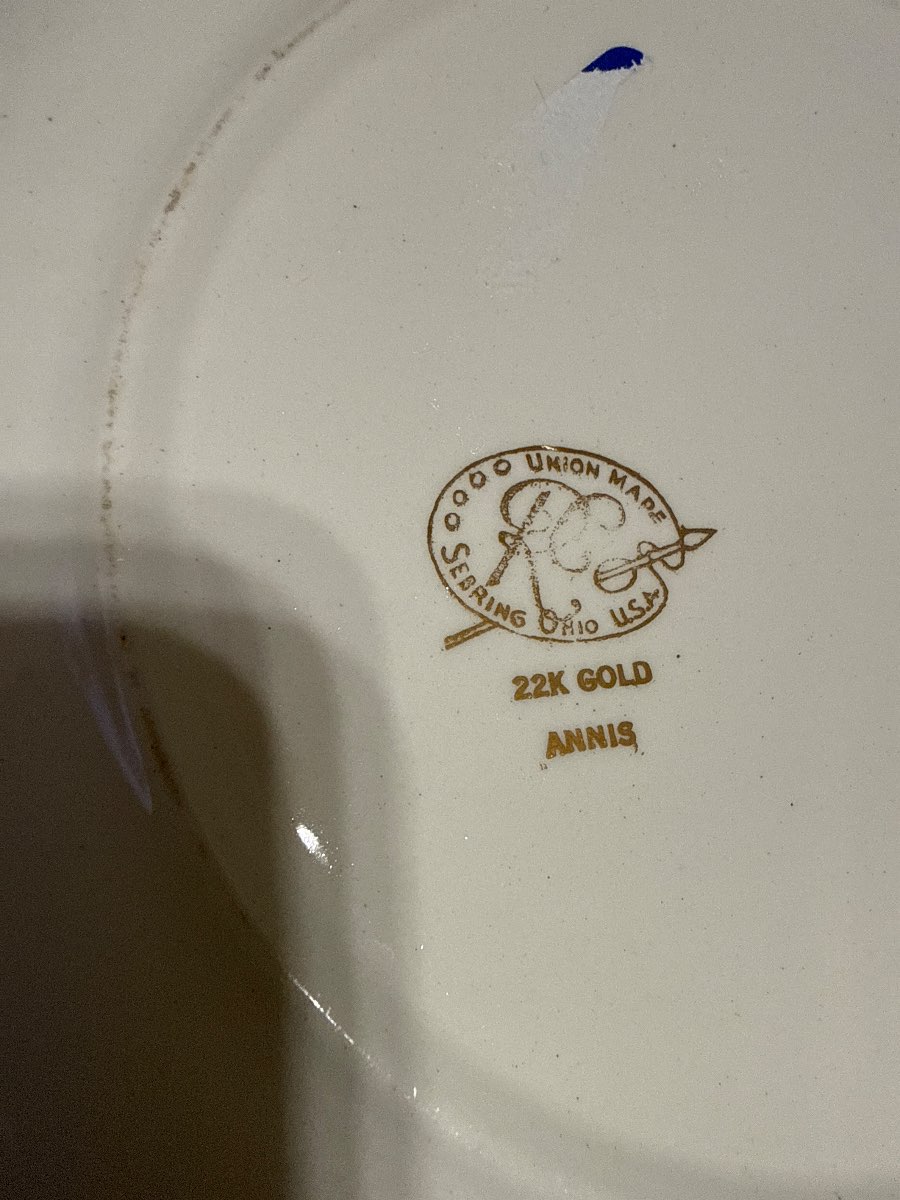 The plate is marked on the underside with the stamp "UNION MADE, SEBRING, OHIO, U.S.A., 22K GOLD, ANNIS." This indicates that it was produced by the Sebring Pottery Company, which was established in 1910 in Sebring, Ohio. The company is known for its high-quality dinnerware and decorative pieces, often featuring gold accents. Sebring pottery is collectible due to its craftsmanship and historical significance in American pottery.