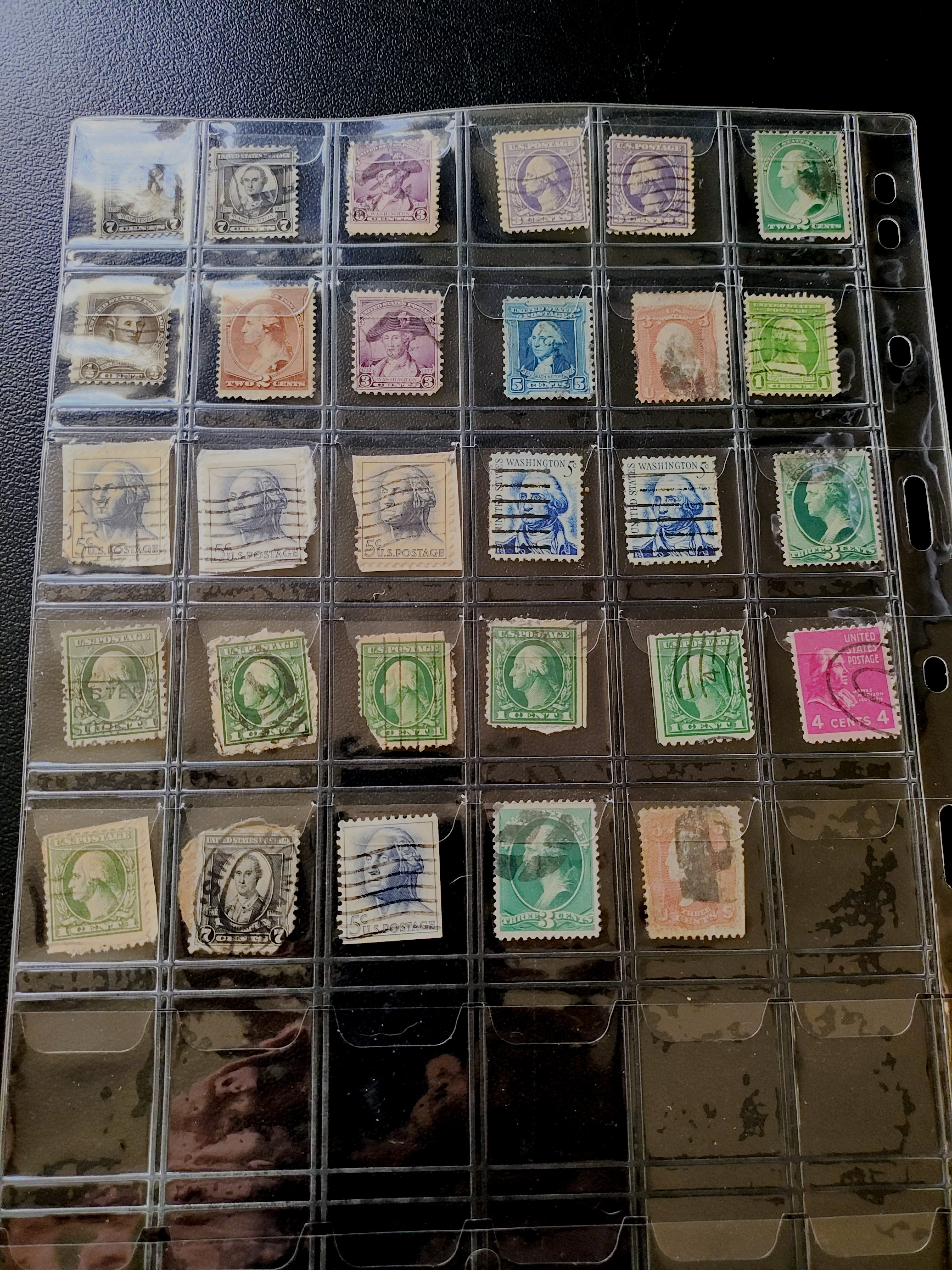 This sheet contains a variety of George Washington stamps, including different denominations, colors, and designs. The stamps range in condition from canceled to unused, stored in a plastic display sheet. These stamps appear to be from the early to mid-20th century, possibly from the Washington-Franklin Issues (1908-1922) and later commemorative or definitive stamp series.
