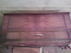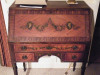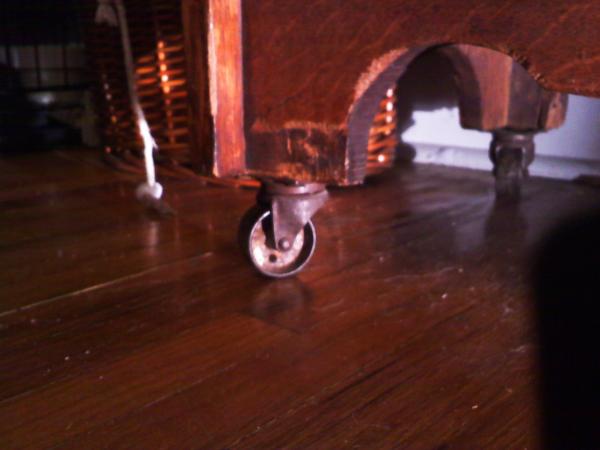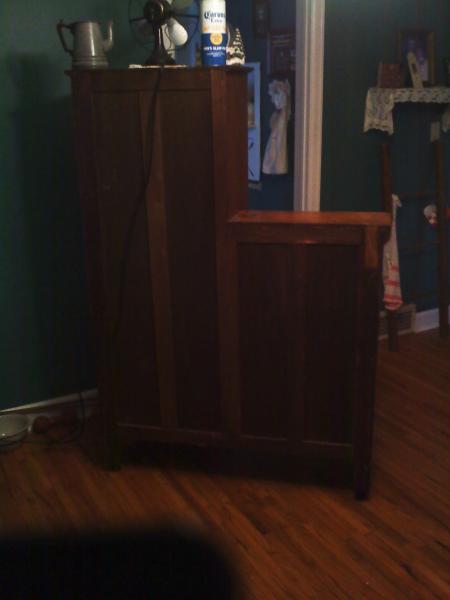 The secratery has 3 drawers on the left side and the secratery or writing area above the drawers. On the left side it has four shelves and a glass front door. It stands on 4 steel type wheels and has never been rebuilt since my grandmother owned it.