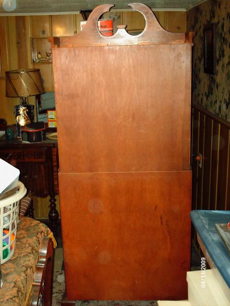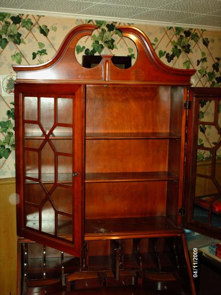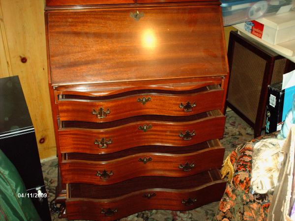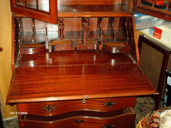Working skeleton key locks center of secretary. Four draws at the bottom with top drawer 13 inches x 27 inches wide, 3 inches in height. Bottom three drawers are same dimensions with height being one inch taller.