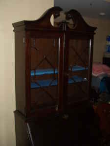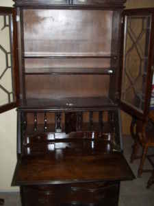 Secretary desk has missing spindle on top. Missing one handle on inside drawer. One of the x's made of wood on the glass door is missing. Has scratches. The usually aging.
