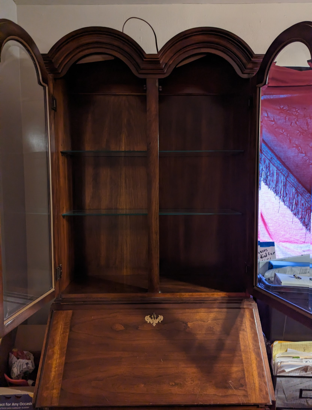 Secretary desk with to light and glass shelves.
