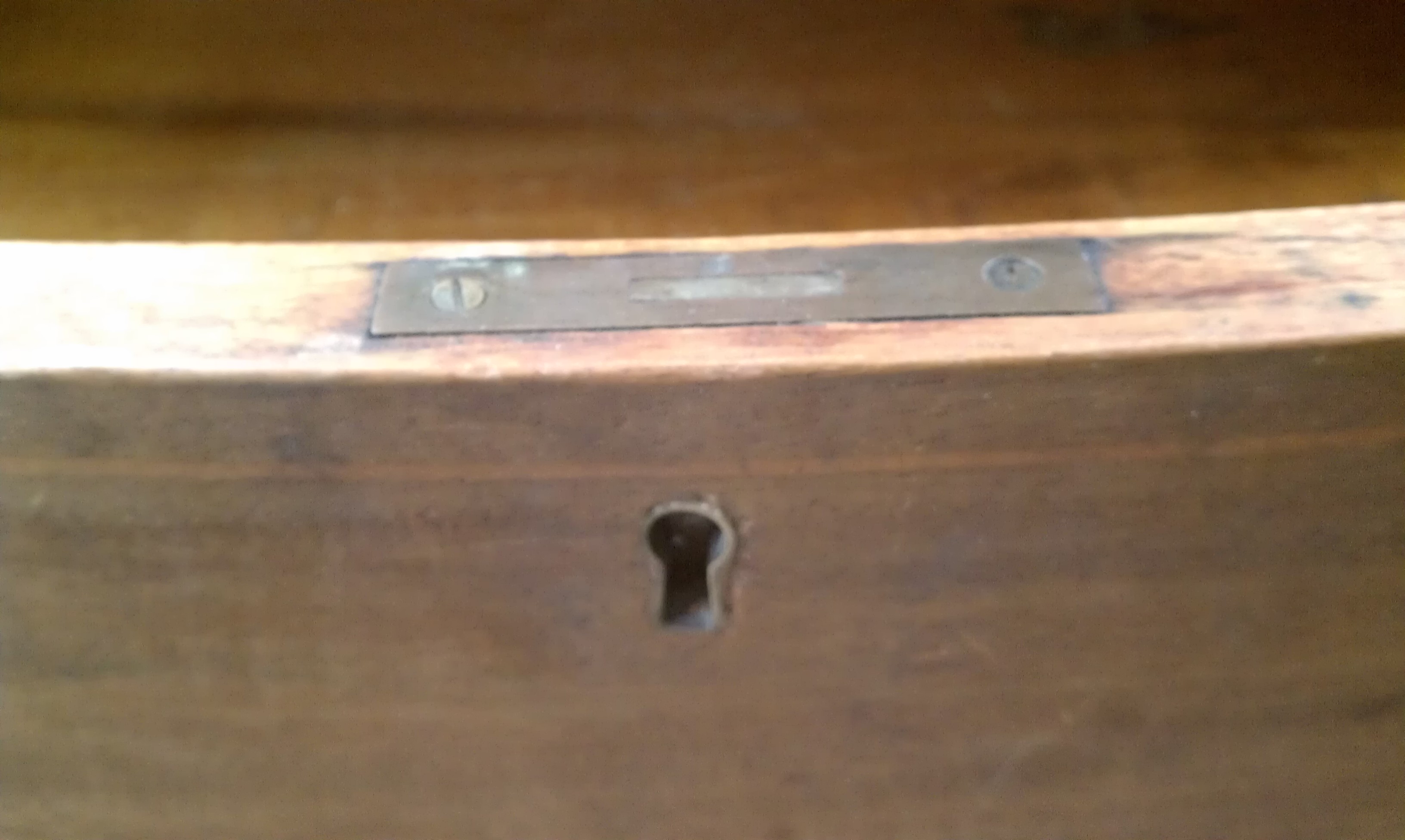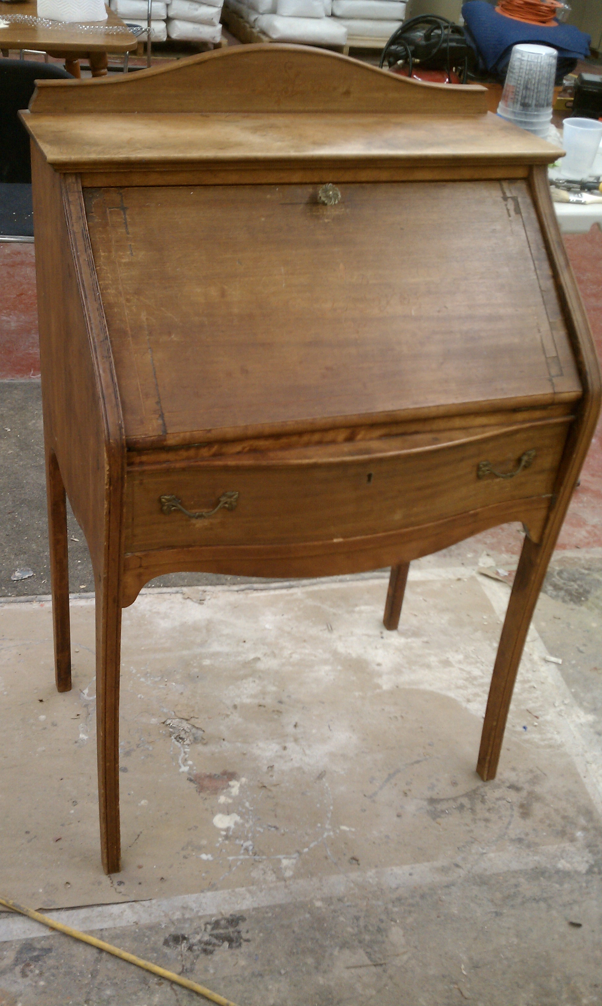 this is a drop down secretary desk. the veneer looks thick and tried the denatured alchol test but we are totally new at this. it has an inlay on the drop down top and on the top rail. there are some numbers stamped on the sides but the back has been replaced. on the back it says 1940 and 23 and on the hinge it says pat.something. the sides look to be carved out of a solid piece of wood. maybe cherry (for the whole piece) there is a key hole on the drawer and the dovetails of the drawer look hand made. I believe the drop down had a keyhole that was replaced with a small knob. Any information you may have on the period and the price would be greatly appreciated.