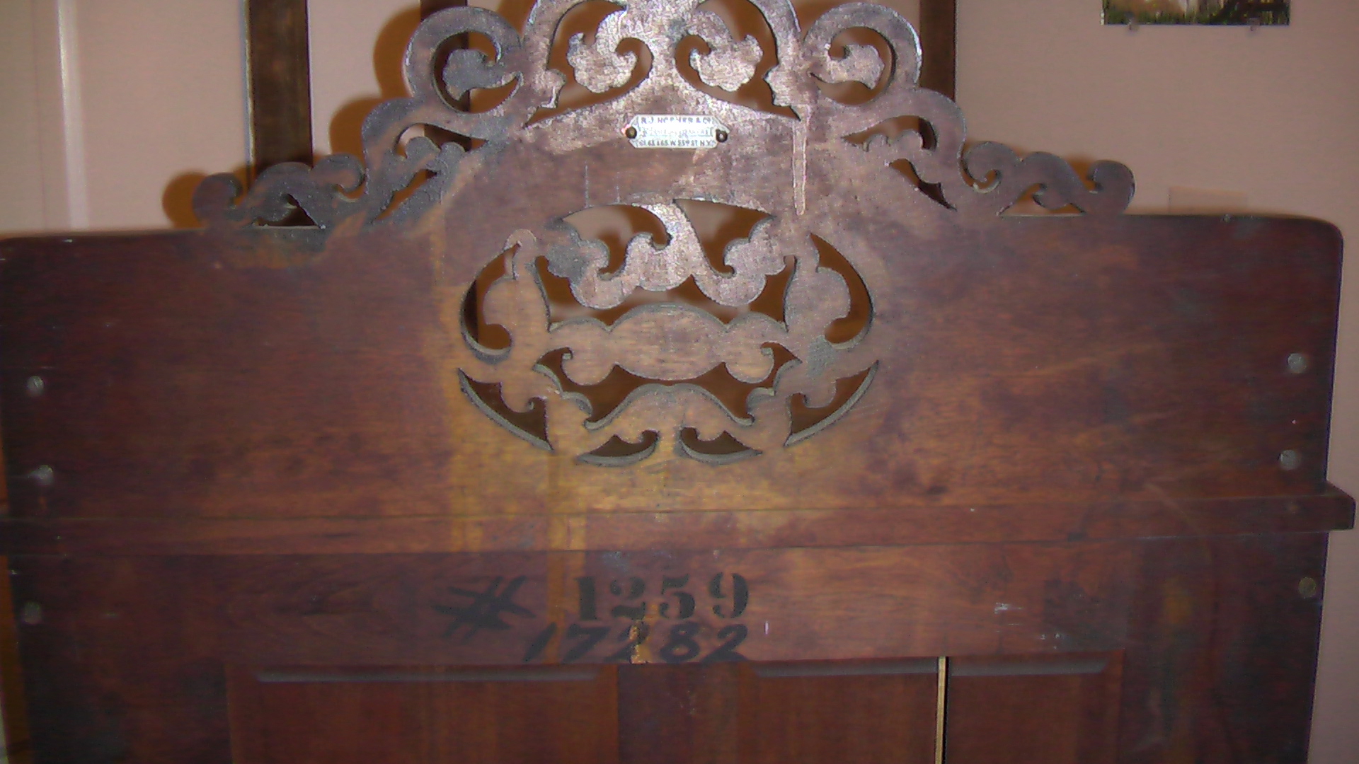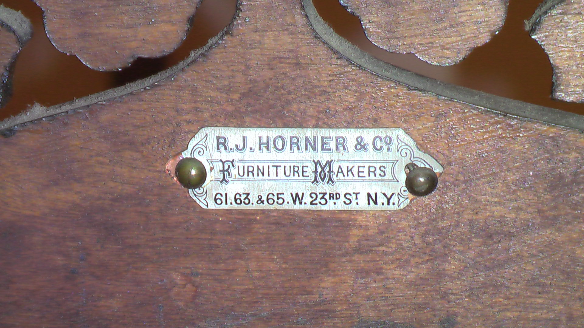 This appears to be a genuine R. J. Horner secretary.  It has two significant defects.  The first is a crack running left to right through the center of the writing desk.  The second is a missing shelf or drawer that was apparently mounted to the bottom of the desk.  All that is left are the broken tracks.  Considering these defects, it is doubtful that it has any current value.  However, an extensive internet search has never yielded a piece that looks like it.  I would be interested to know what its value might have been in good condition, when it was manufactured and what the numbers on the back of the piece mean.  Any information at all about this piece is welcome.