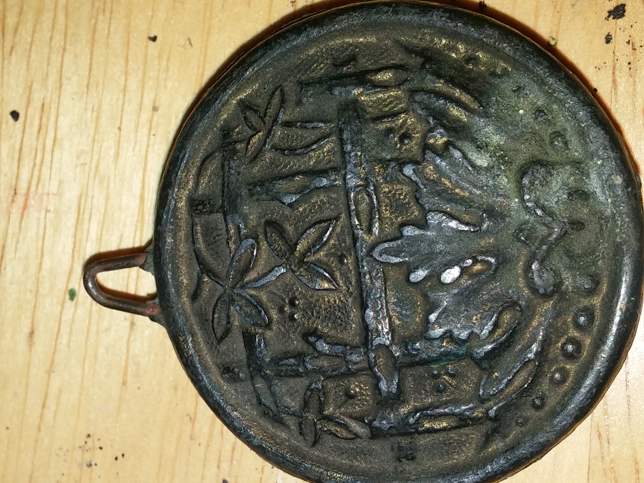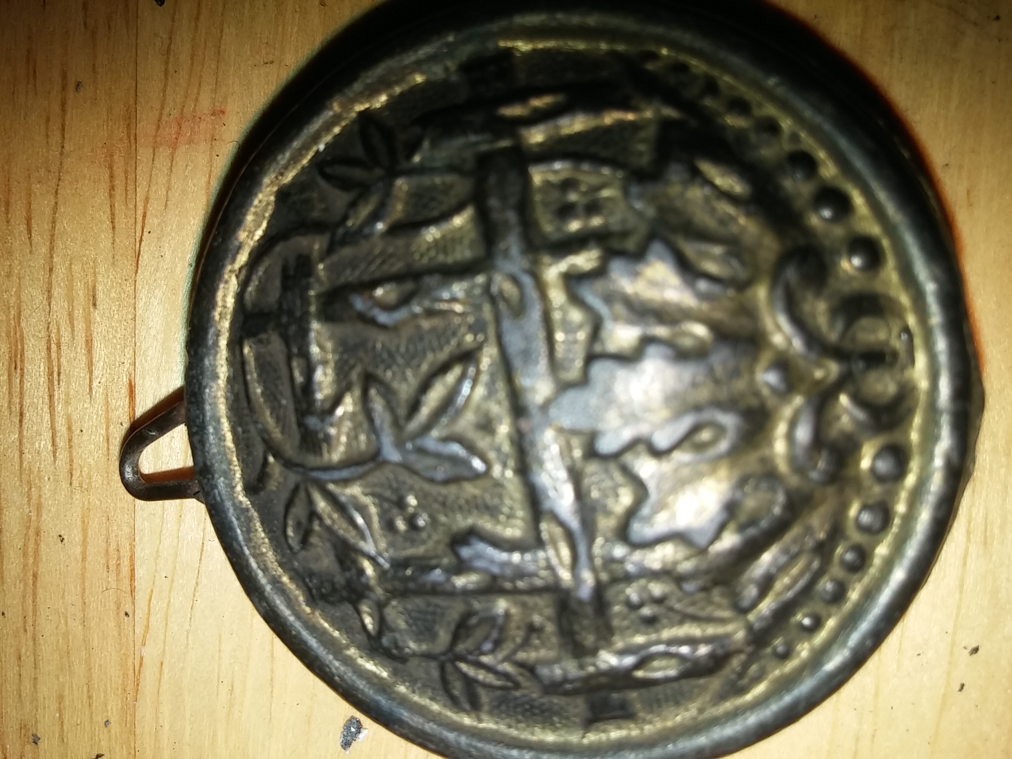 Possibly an Irokane button! Gold is uncommon on the islands of Japan, so to make what they had go further the Japanese alloyed it with bronze to create a substance called Irokane. It was predominantly used to make the guards on the katanas of samurai, and when the samurai class was abolished during the Meiji Restoration the smiths specializing in Irokane switched over to making buttons for the uniforms of the newly minted professional military officers of the reformed and westernized Japanese military.
