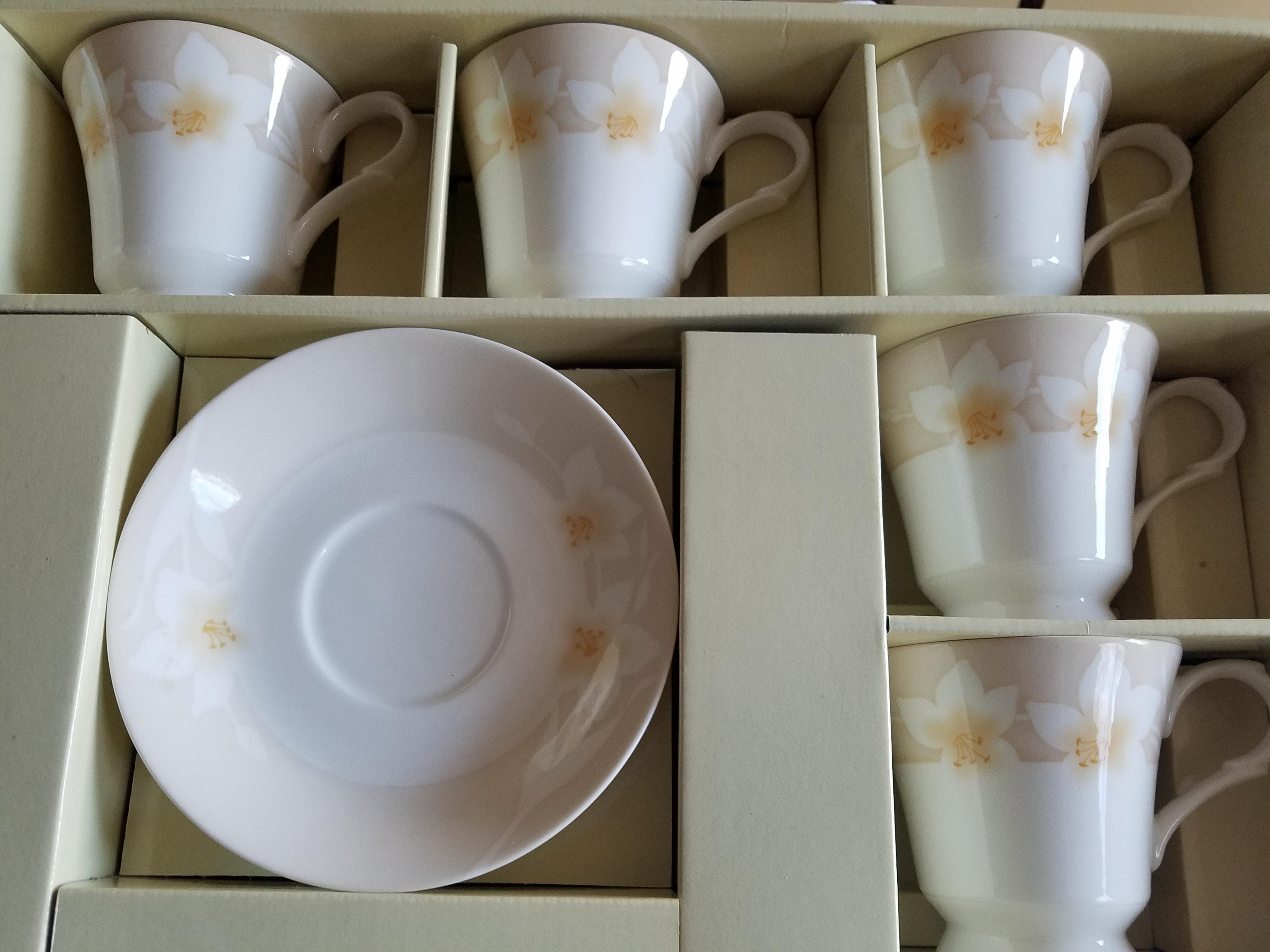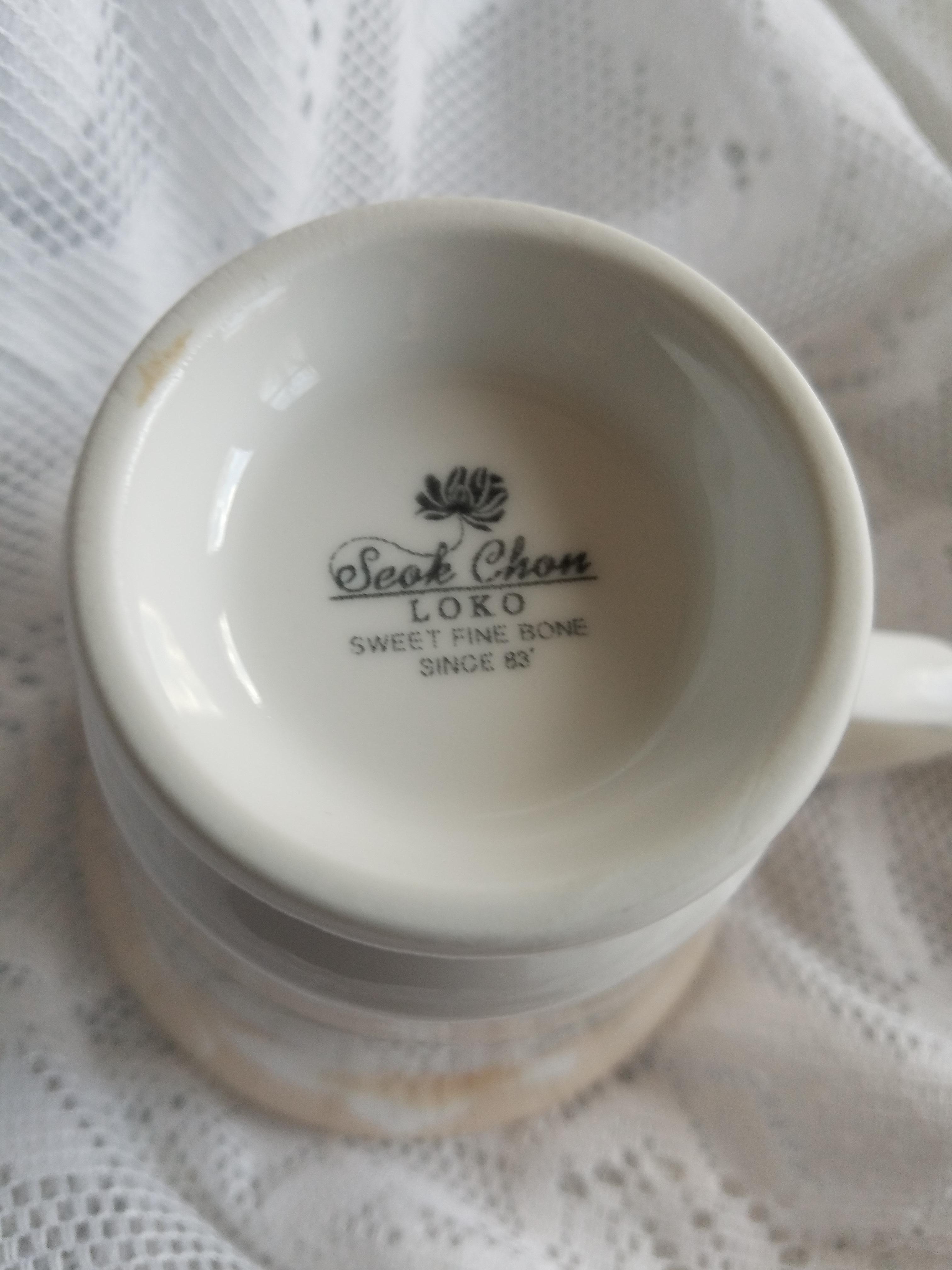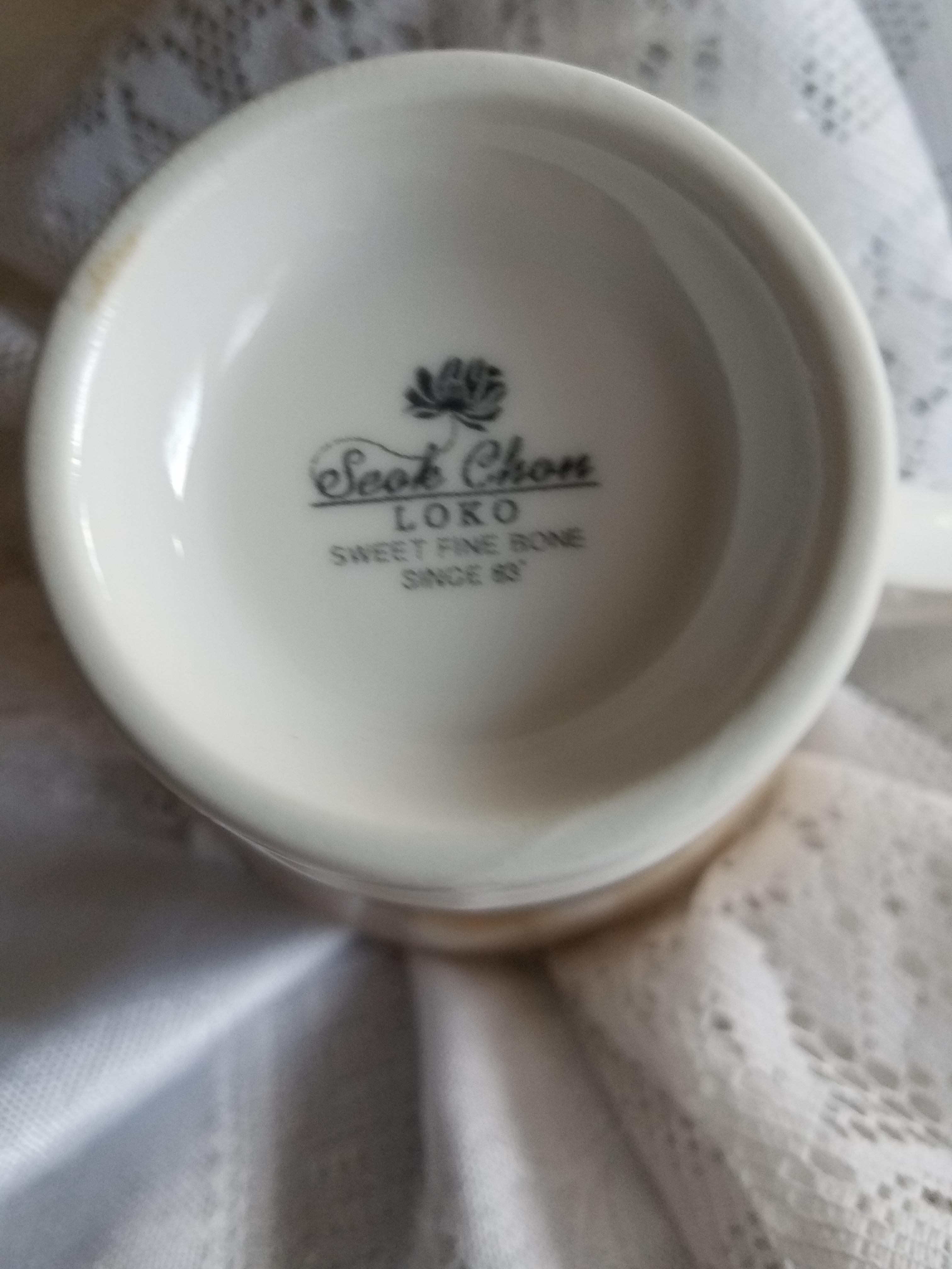 I have never used still in the box, Seok Chon, LOKO Sweet Fine Bone Since 83'. That came right off the box. Patternis "Freesia" The box appears to have handwritten chinese writting. The Box contains 5 sets of Bone China, Teacups & saucers. Base Color is an eggshell, 2/3 up cup from foot to top, is a pink, faded into yellow then white to the end of pedals of the flower. Cup has 1 side 2 flowers 2/3 up and otherside has 1 flower. same as saucer. 2/3 up when flower begins also a band of light beige, also creats a band to the tip of cup and same with saucer, to the rim. Trying to find out history & value. They come up no where i have searched..ty