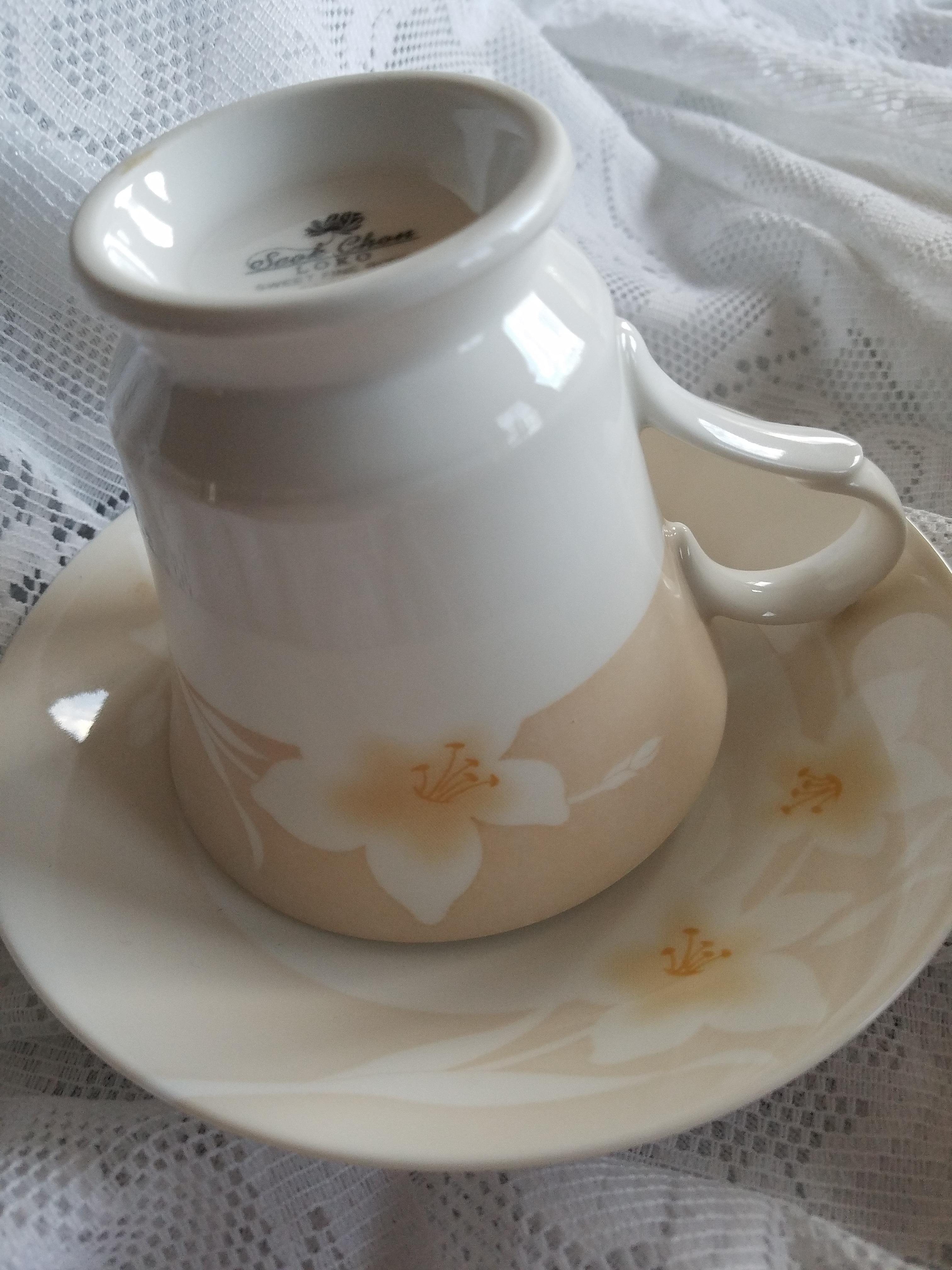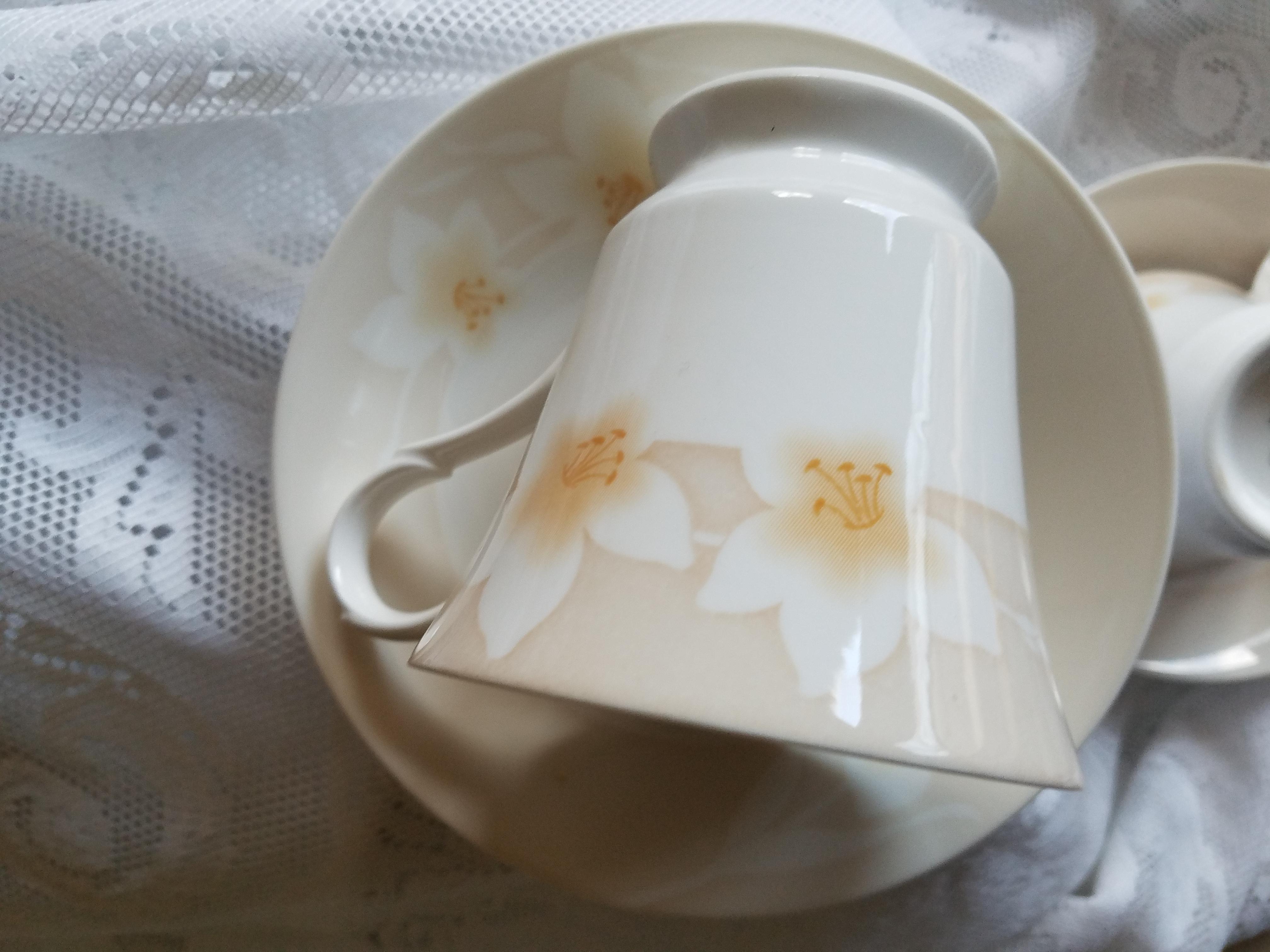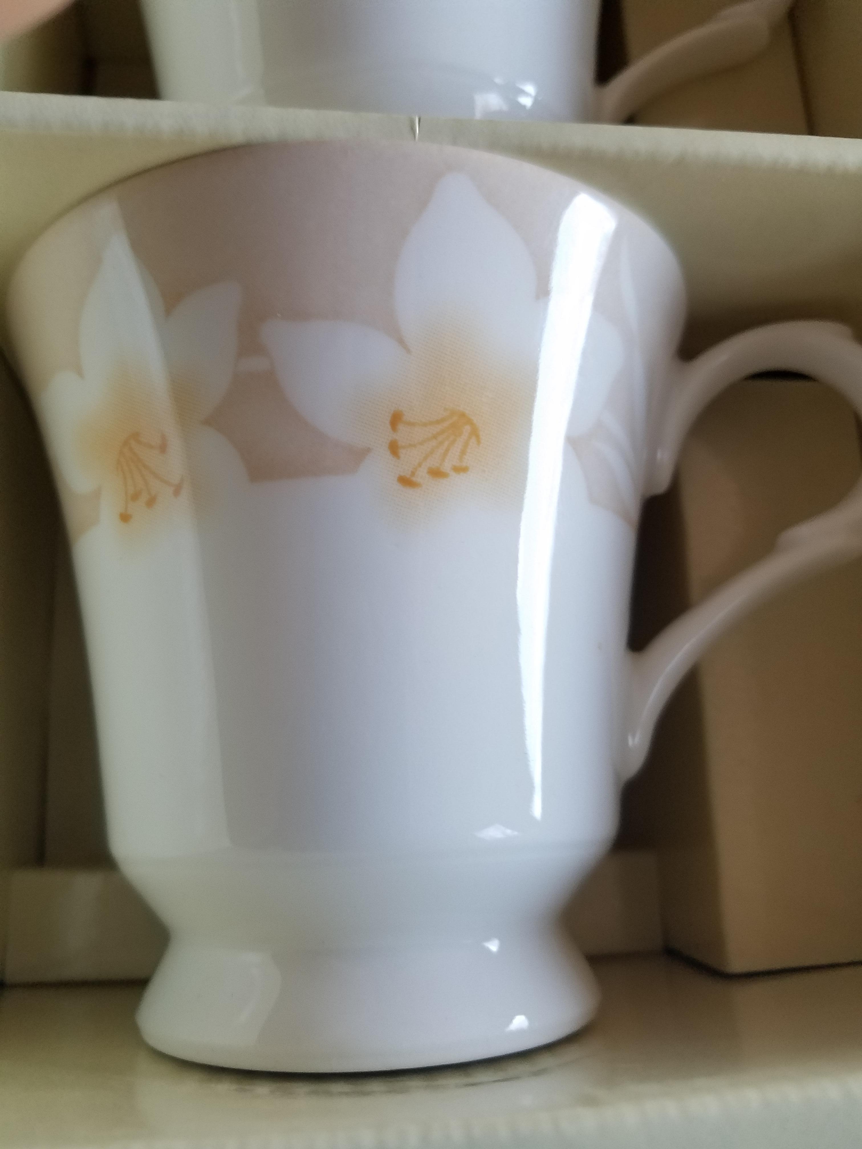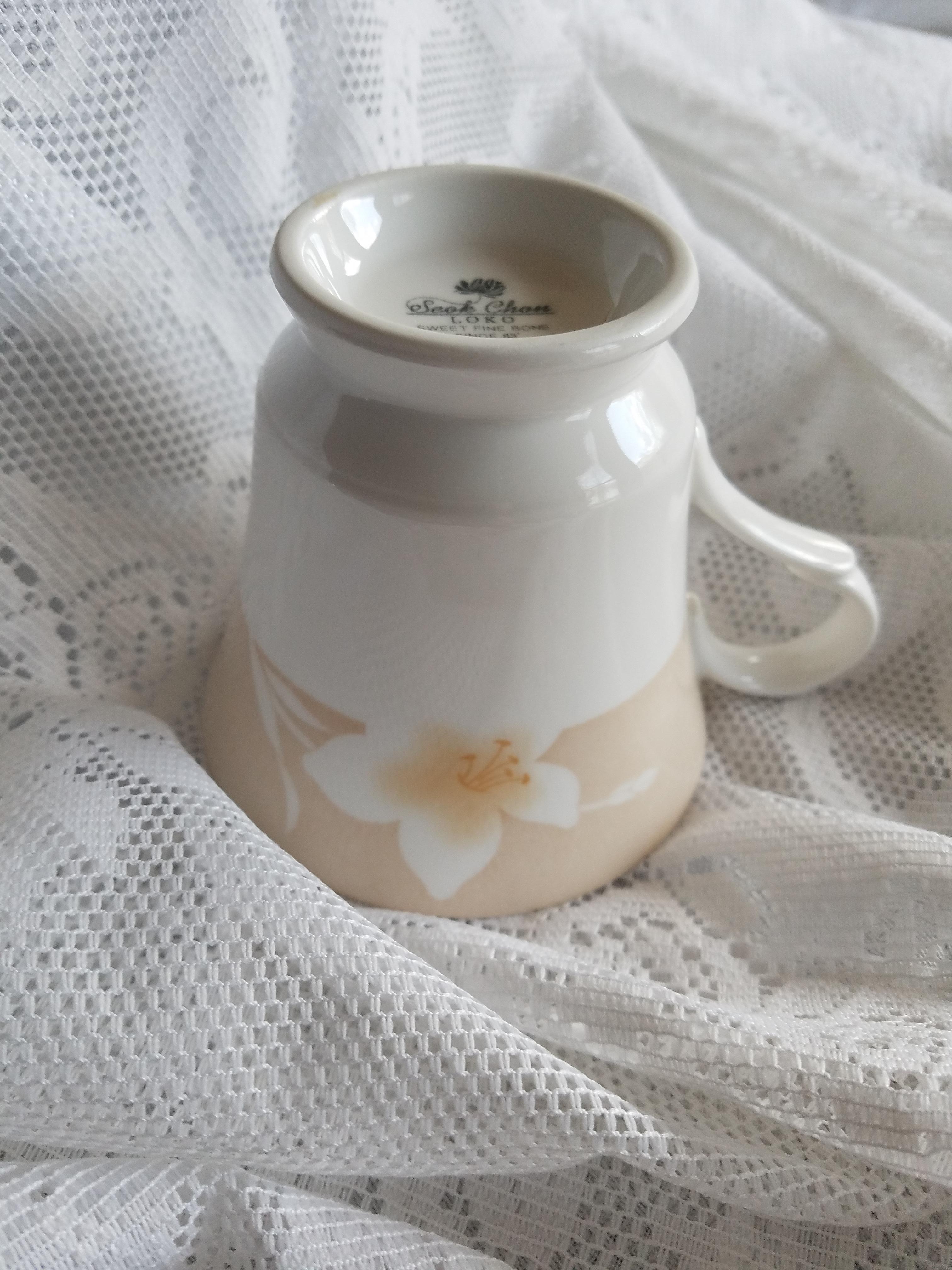 I have never used still in the box, Seok Chon, LOKO Sweet Fine Bone Since 83'. That came right off the box. Patternis "Freesia" The box appears to have handwritten chinese writting. The Box contains 5 sets of Bone China, Teacups & saucers. Base Color is an eggshell, 2/3 up cup from foot to top, is a pink, faded into yellow then white to the end of pedals of the flower. Cup has 1 side 2 flowers 2/3 up and otherside has 1 flower. same as saucer. 2/3 up when flower begins also a band of light beige, also creats a band to the tip of cup and same with saucer, to the rim. Trying to find out history & value. They come up no where i have searched..ty