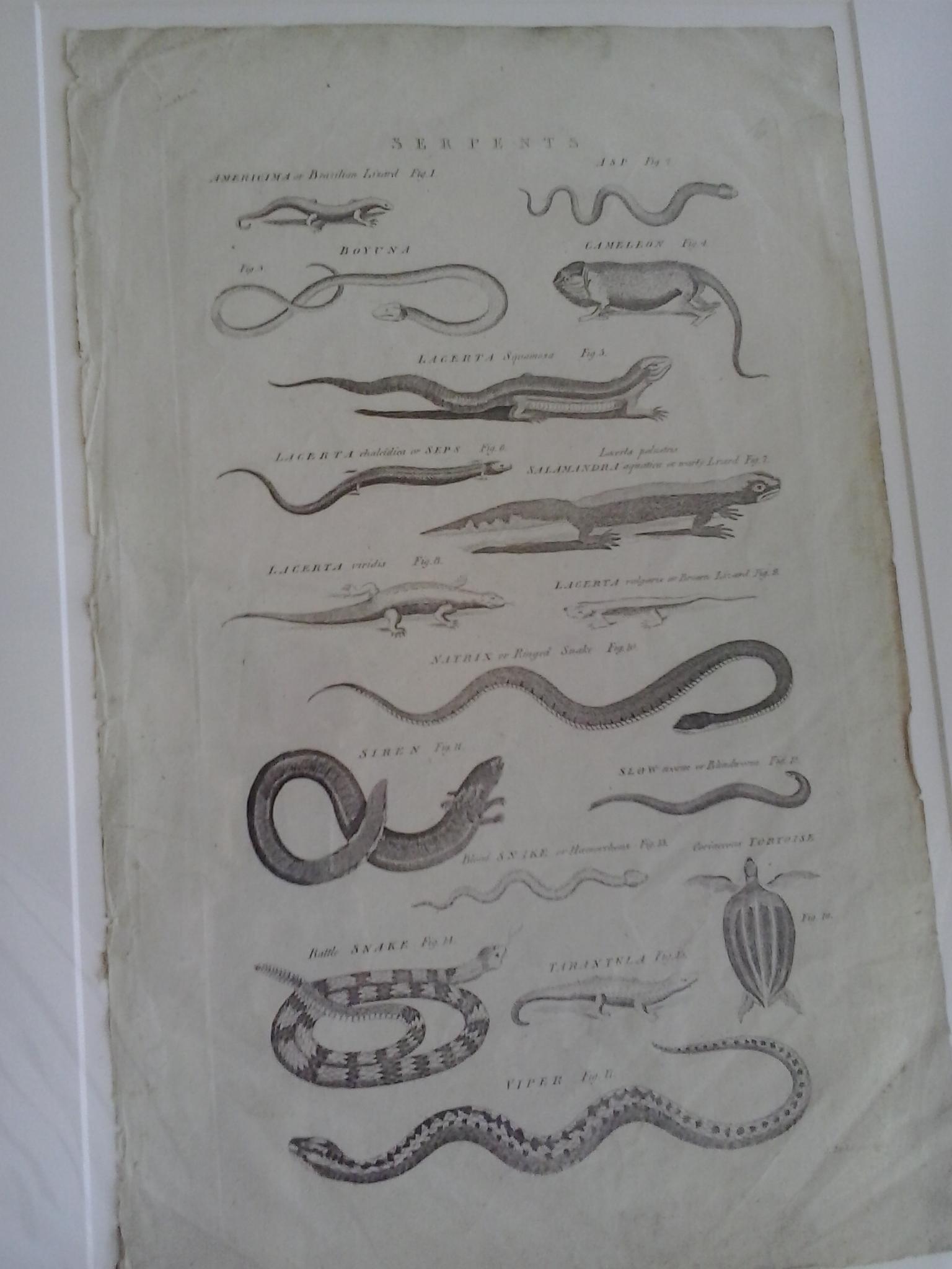 Hi I have a 42cm x 26.5cm book/folio page that looks very old and is entitled "Serpents". The bottom right has "I.Taylor" written very faintly. It has 17 illustrations of various serpents. I know nothing about its origin age or value as I just bought it at a second-hand shop in a frame. Many thanks, Naomi. Please feel free to ask more questions.