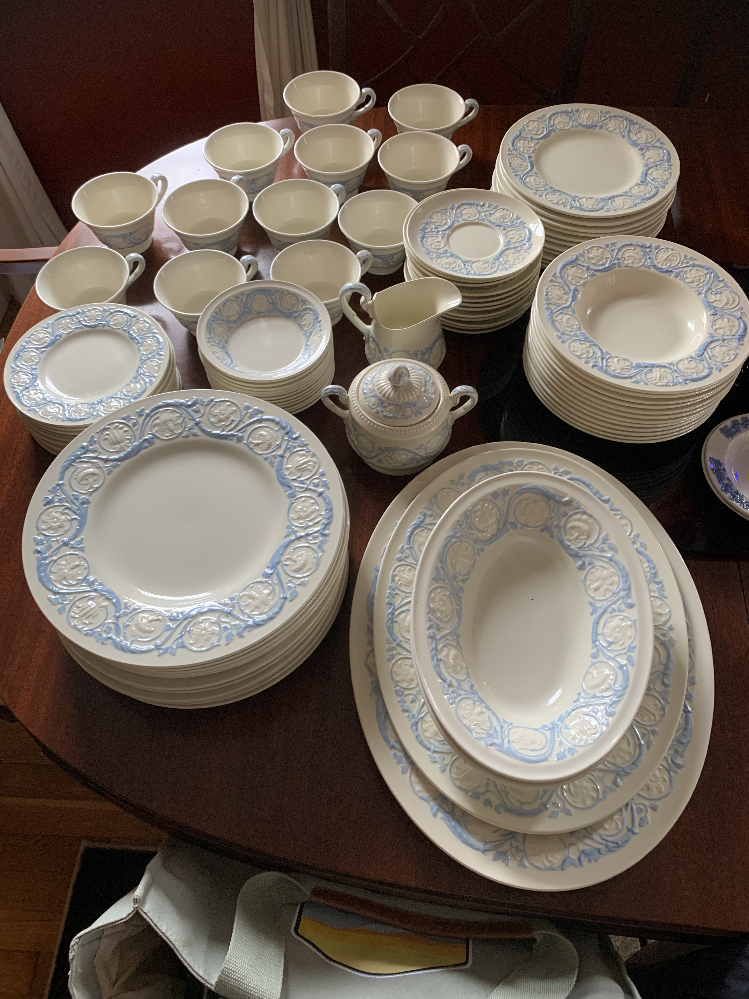 This is a complete 12-place setting of fine bone china by Wedgwood, in the Etruria & Barlaston “Kingston” pattern (T272), featuring a raised cameo and scroll design in blue over cream. The style is instantly recognizable by its elegant neoclassical relief border and soft, almost matte glaze finish.