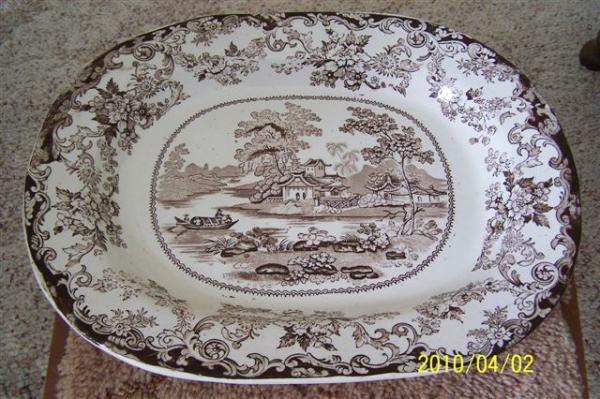 I do not know very much about this dish. It is in very nice condition. I think it is transferware, but unsure of the pattern name. It was given to my great-grandmother, who collected fine glassware.