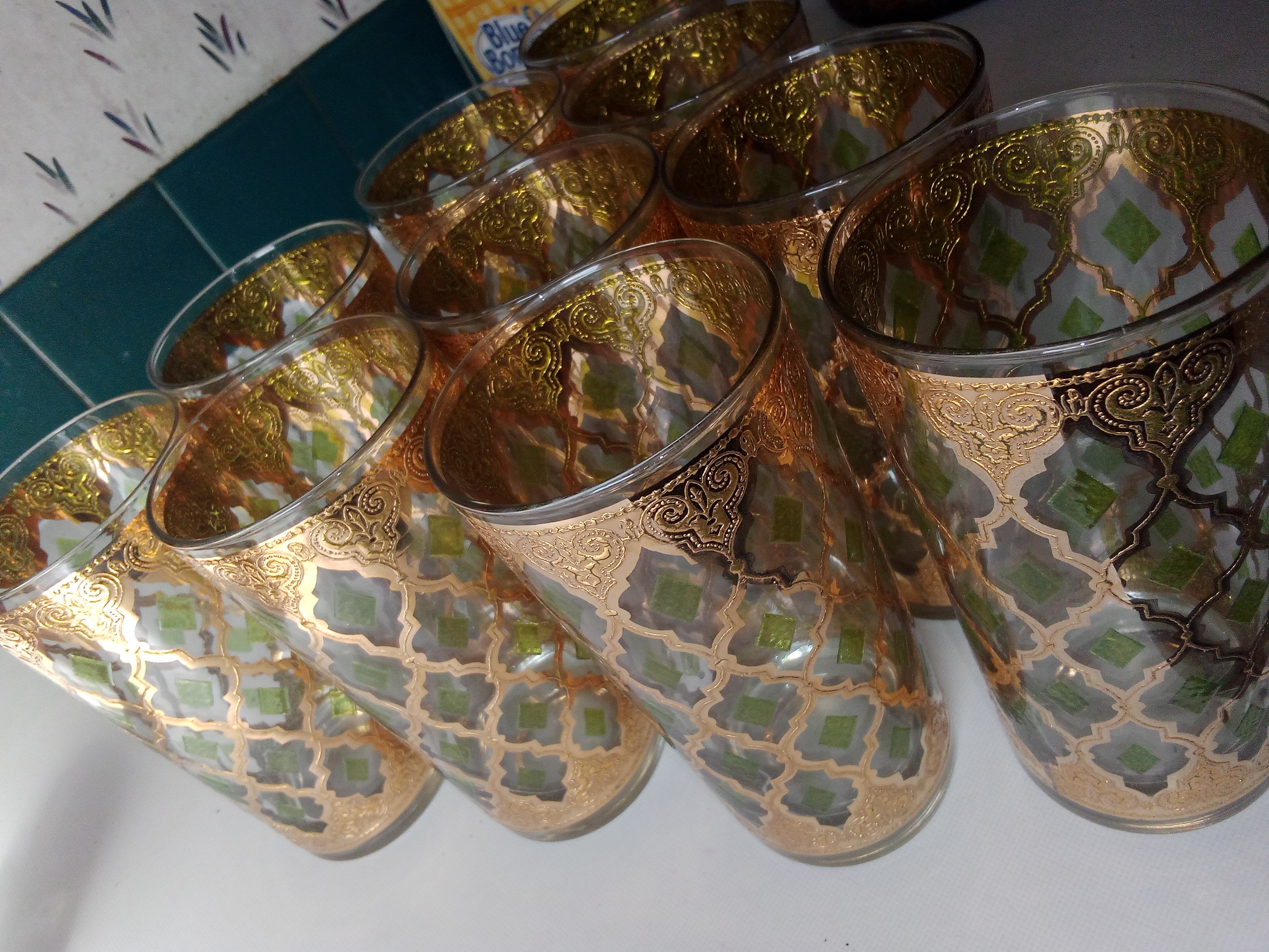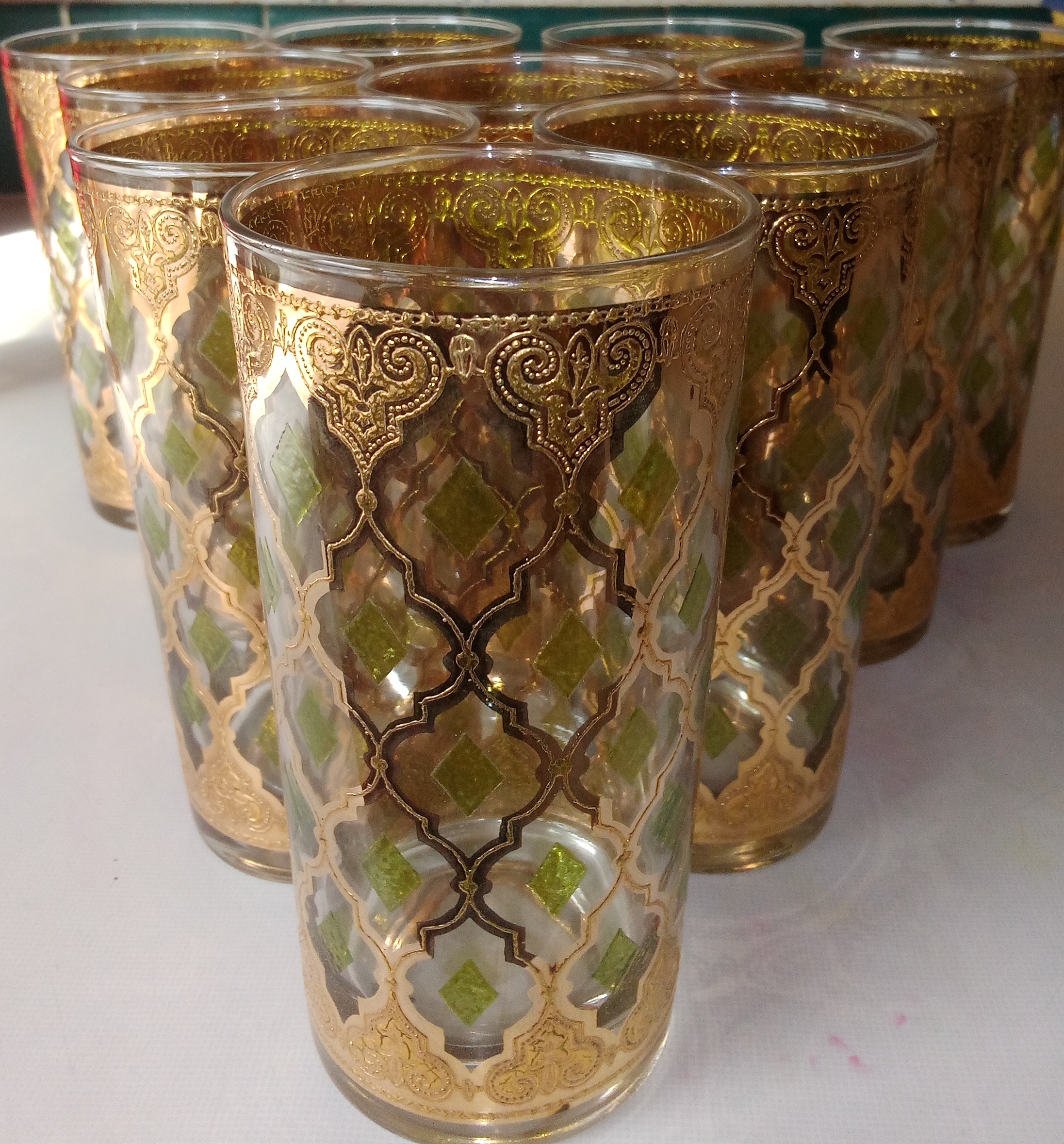 The Vintage Culver Valencia Highball Glasses are a luxurious addition to any home bar or collection. Featuring elegant 22-karat gold and blue accents, these highball glasses embody sophistication and charm. Crafted by the renowned brand Culver, these timeless pieces will enhance any drinkware collection. Ideal for serving cocktails or highballs, these glasses are designed to impress guests and elevate the drinking experience. This specific vintage Culver Valencia highball glass is notable for its intricate design, which showcases a striking Moorish-style trellis pattern embellished with 22-karat gold and green enamel diamond accents. **Details of the CULVER MCM VALENCIA Highball Glass:** - **Era:** Produced by Culver Ltd. in the 1960s - **Material:** Glass, featuring a superheated roll-on application for the 22-karat gold - **Size:** 5 1/2 inches tall - **Capacity:** 12 ounces - **Style:** 22-karat gold with a green diamond filigree design - **Set:** Includes 10 glasses