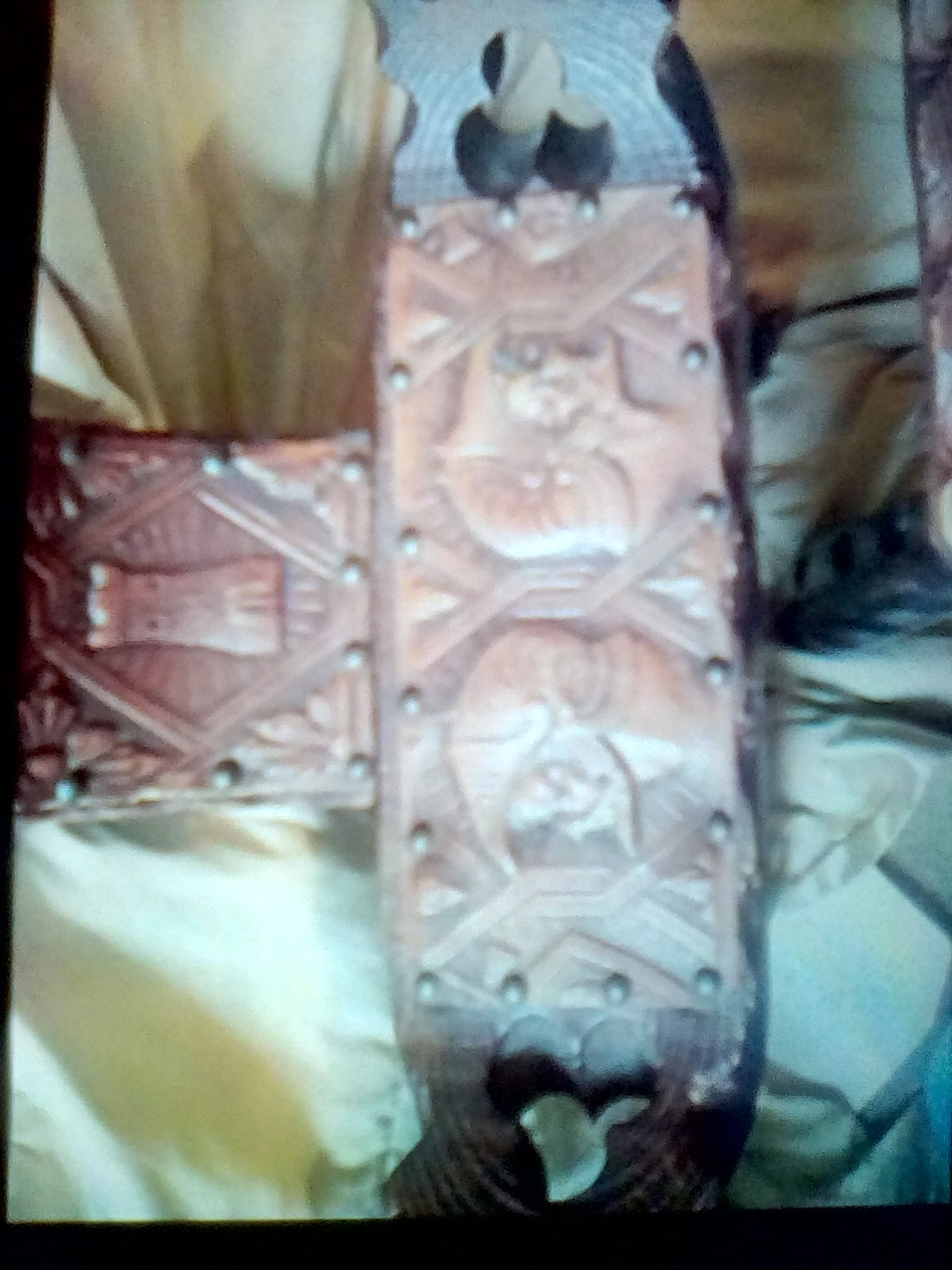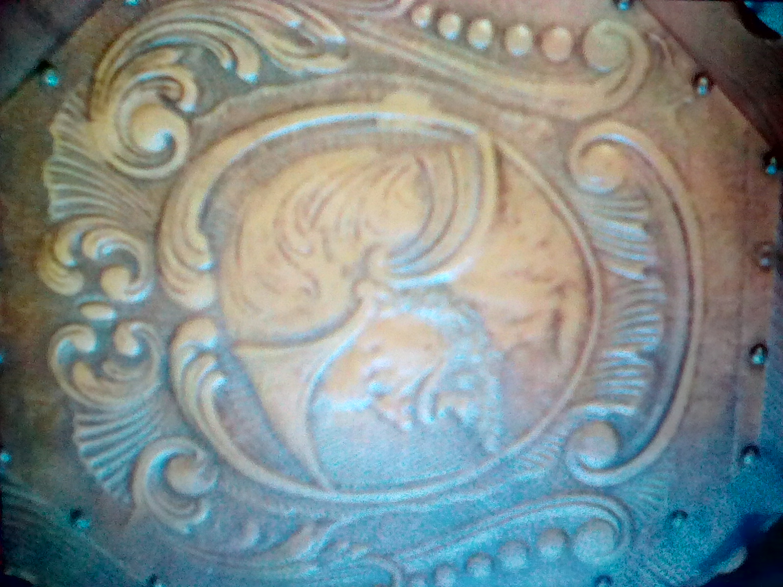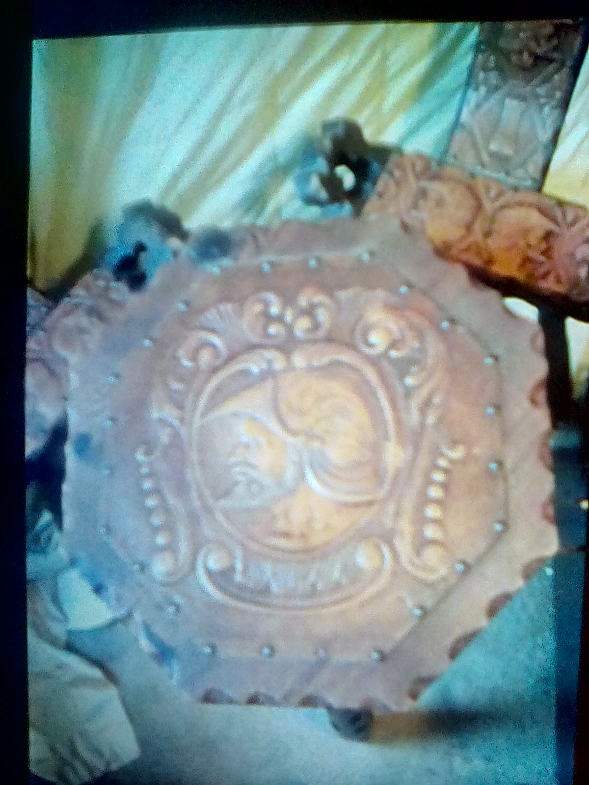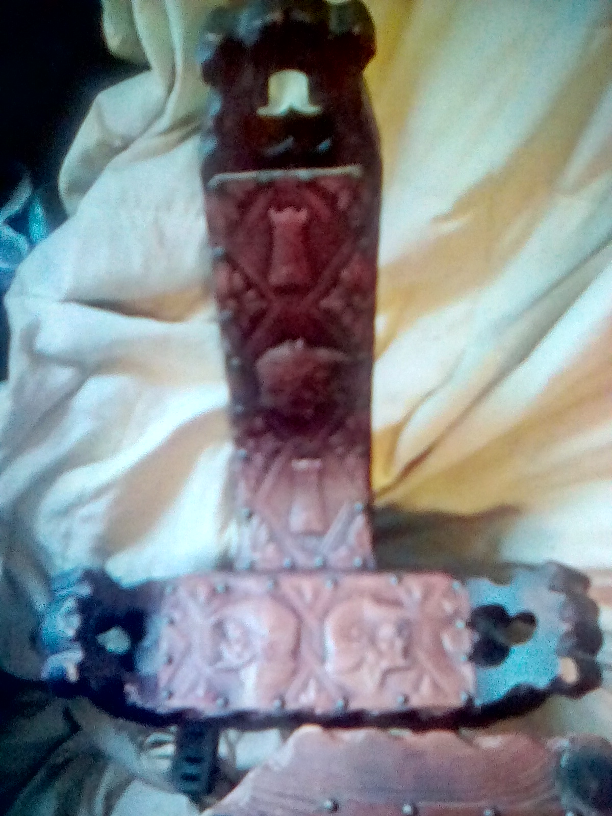 Table of 1 (one) - slightly lighter wood, also appears to be hand carved, embossed on the top with leather tacked in placed with brads made of a ferrous metal.