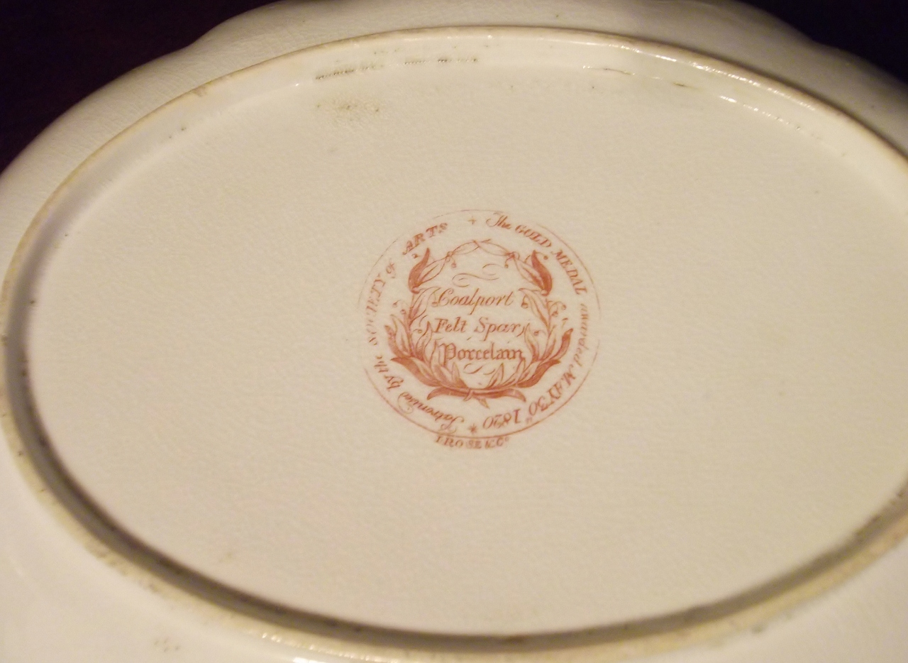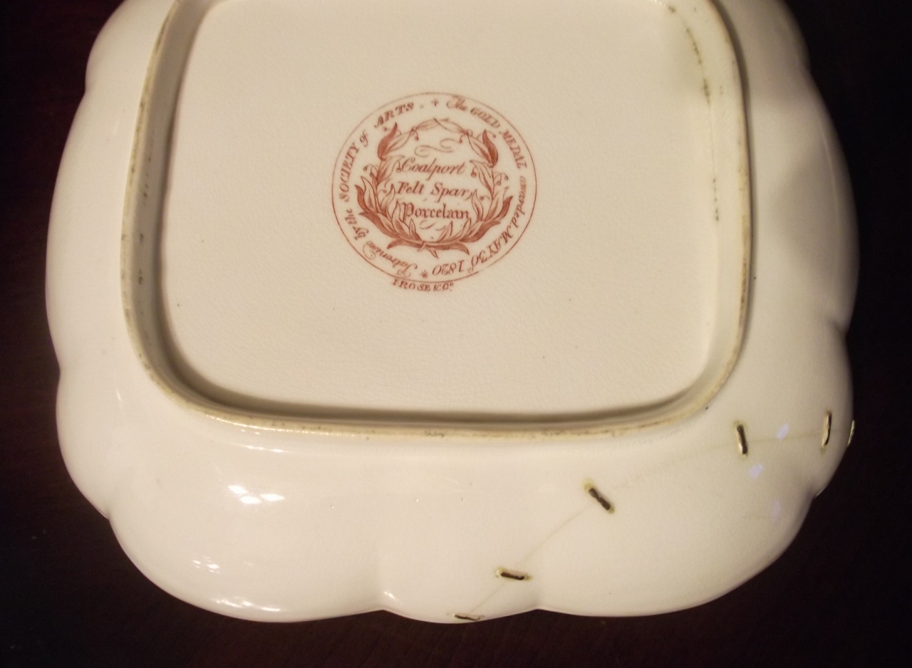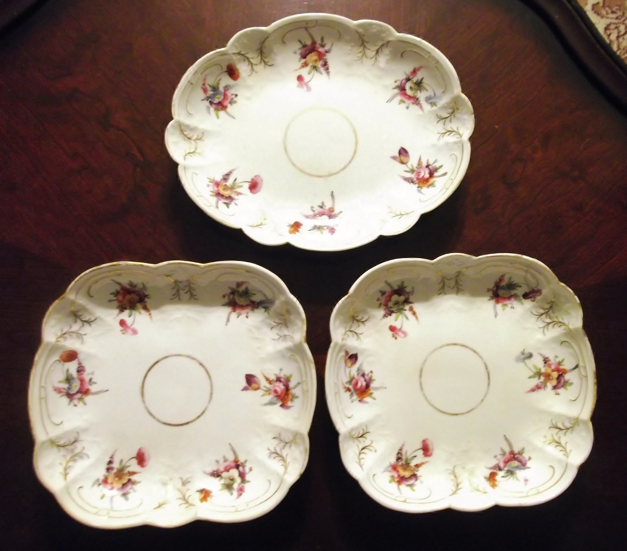 Set of 3 Coalport Feltspar Porcelain Serving Dishes~ Marked "Gold Medal Award May 30th, 1820...Patronized by the Society of Arts..J. Rose & Co. Coalport Feltspar Porcelain" in red. All 3 pieces are in the same pattern of off white with hand painted flowers and gold gilt and have scalloped edges. The 2 square plates are the same size 8" x 9" and the oval plate is 8.5" x 10.5".