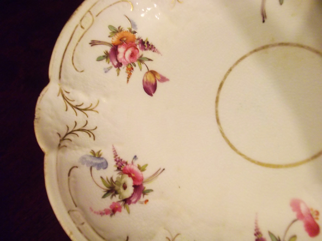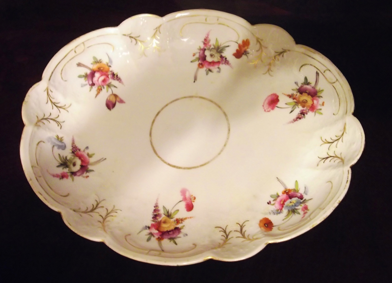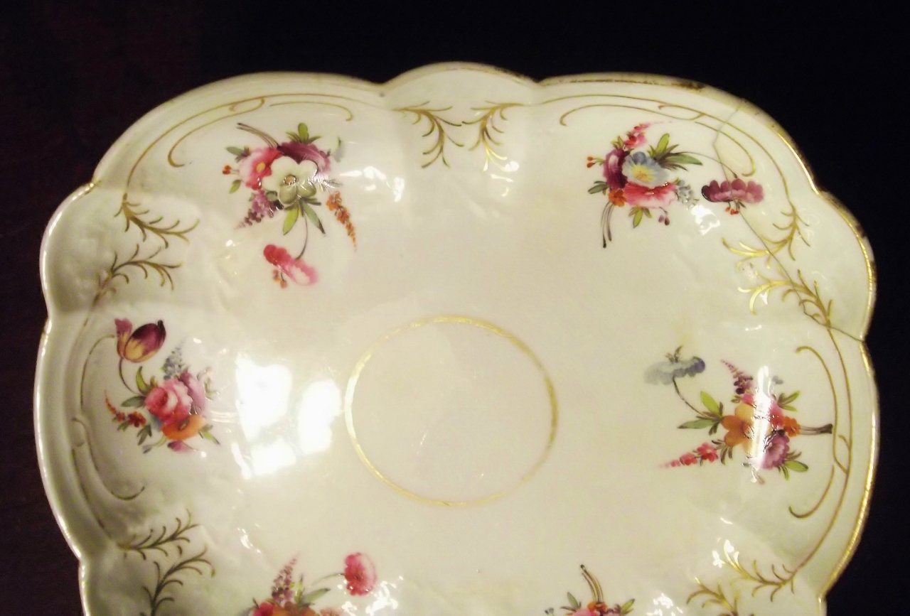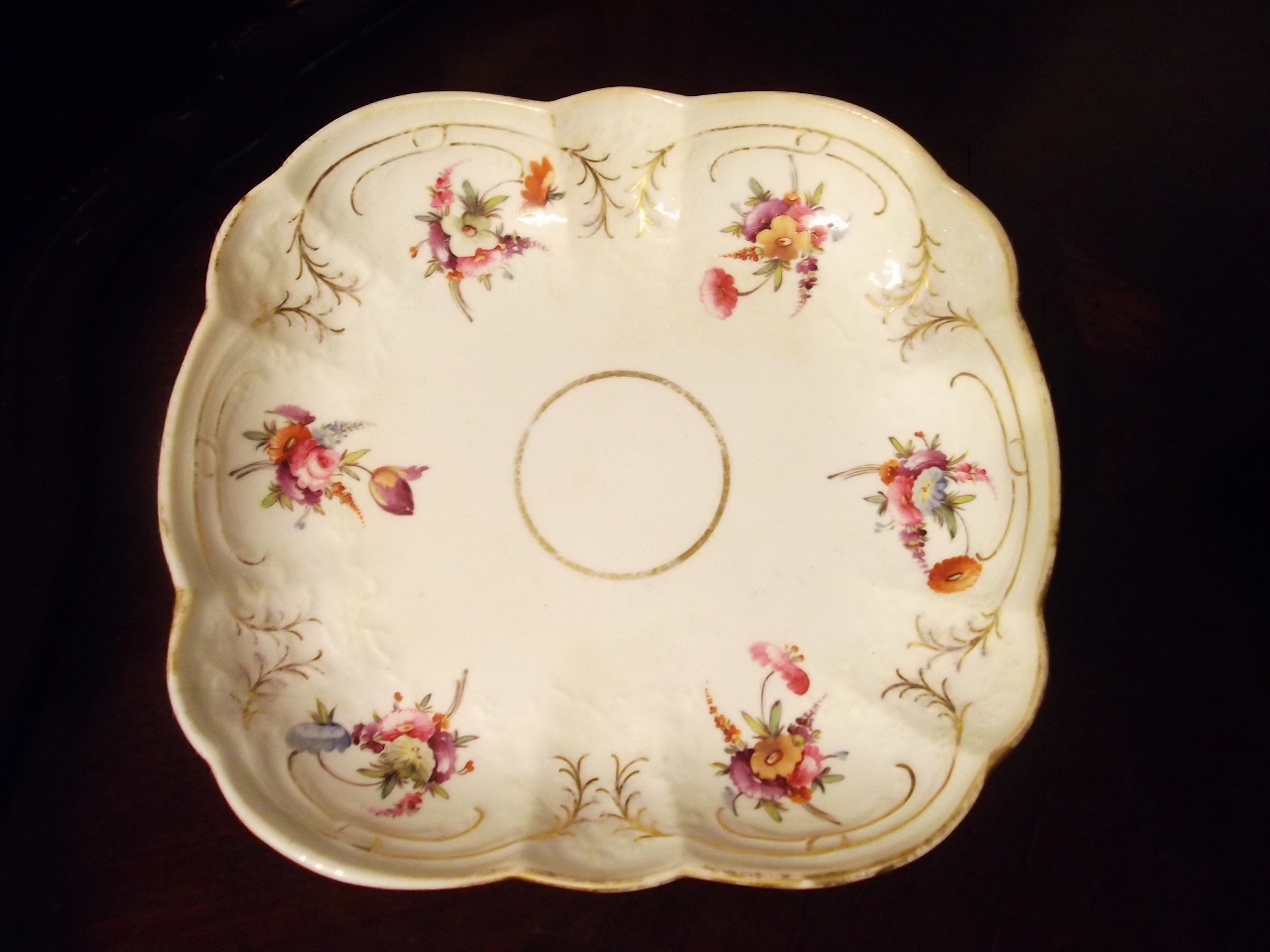 Set of 3 Coalport Feltspar Porcelain Serving Dishes~ Marked "Gold Medal Award May 30th, 1820...Patronized by the Society of Arts..J. Rose & Co. Coalport Feltspar Porcelain" in red. All 3 pieces are in the same pattern of off white with hand painted flowers and gold gilt and have scalloped edges. The 2 square plates are the same size 8" x 9" and the oval plate is 8.5" x 10.5".