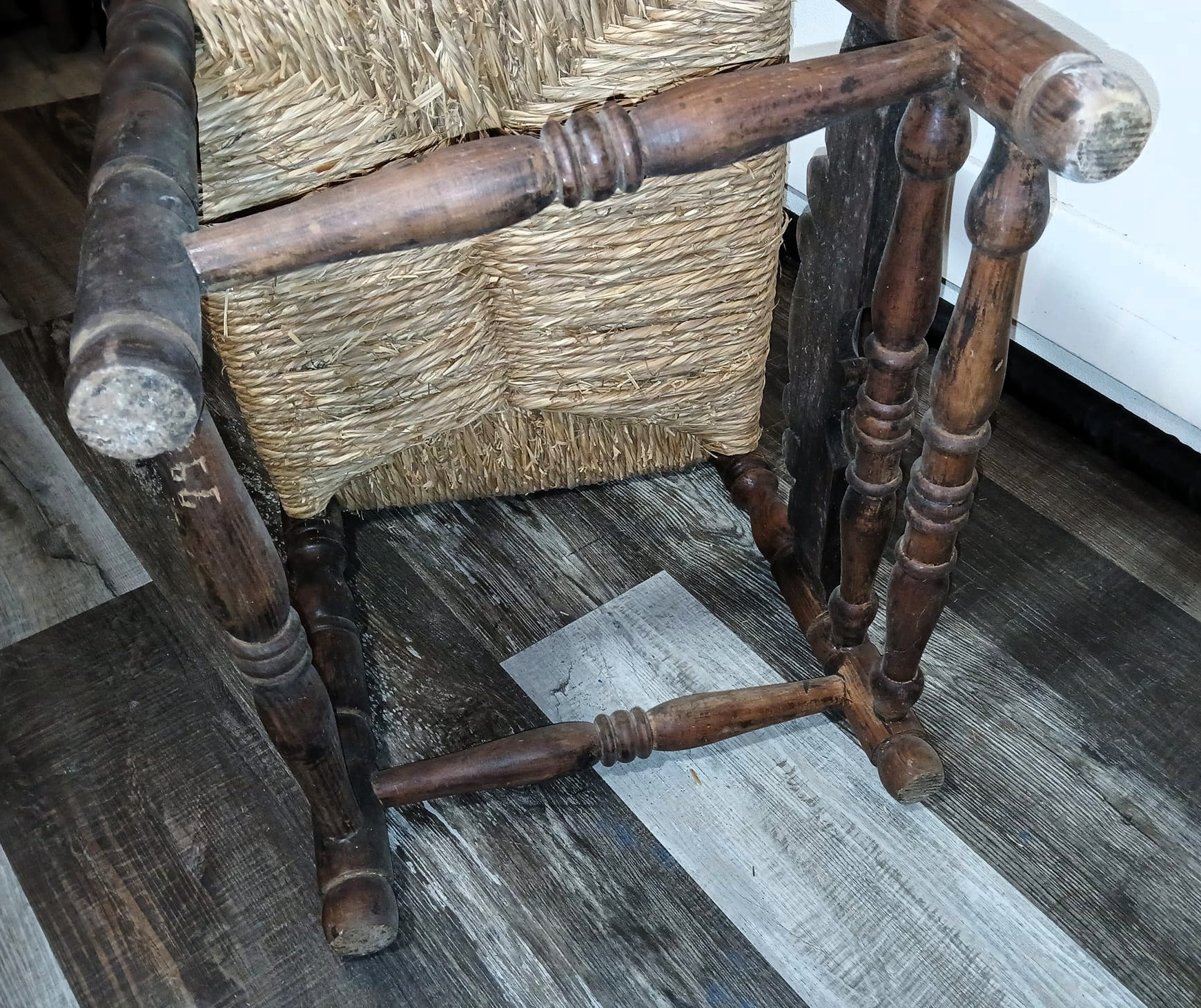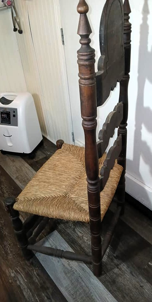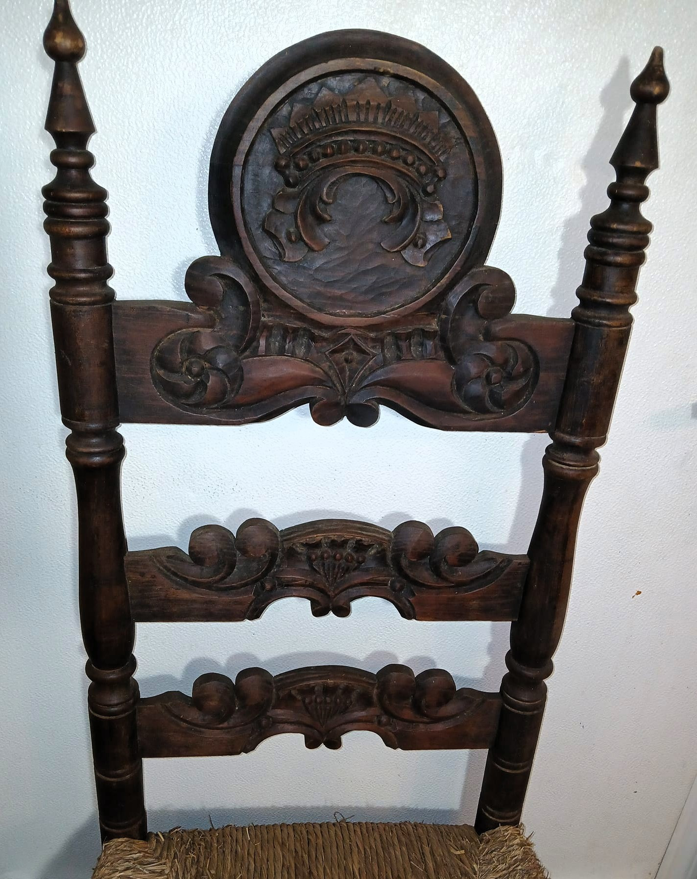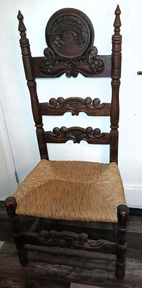 These chairs appear to be antique European-style ladder-back chairs, possibly from the late 19th or early 20th century. The highly ornate carving, turned spindle legs, and rush seats suggest French or Spanish Baroque Revivalinfluence.