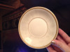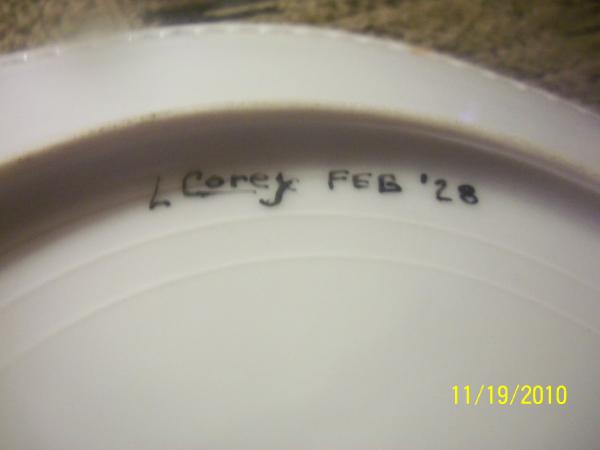 4 white porcelain gold rimmed plates with descriptive flowers on the front, specific name L Corey '28 written on back.