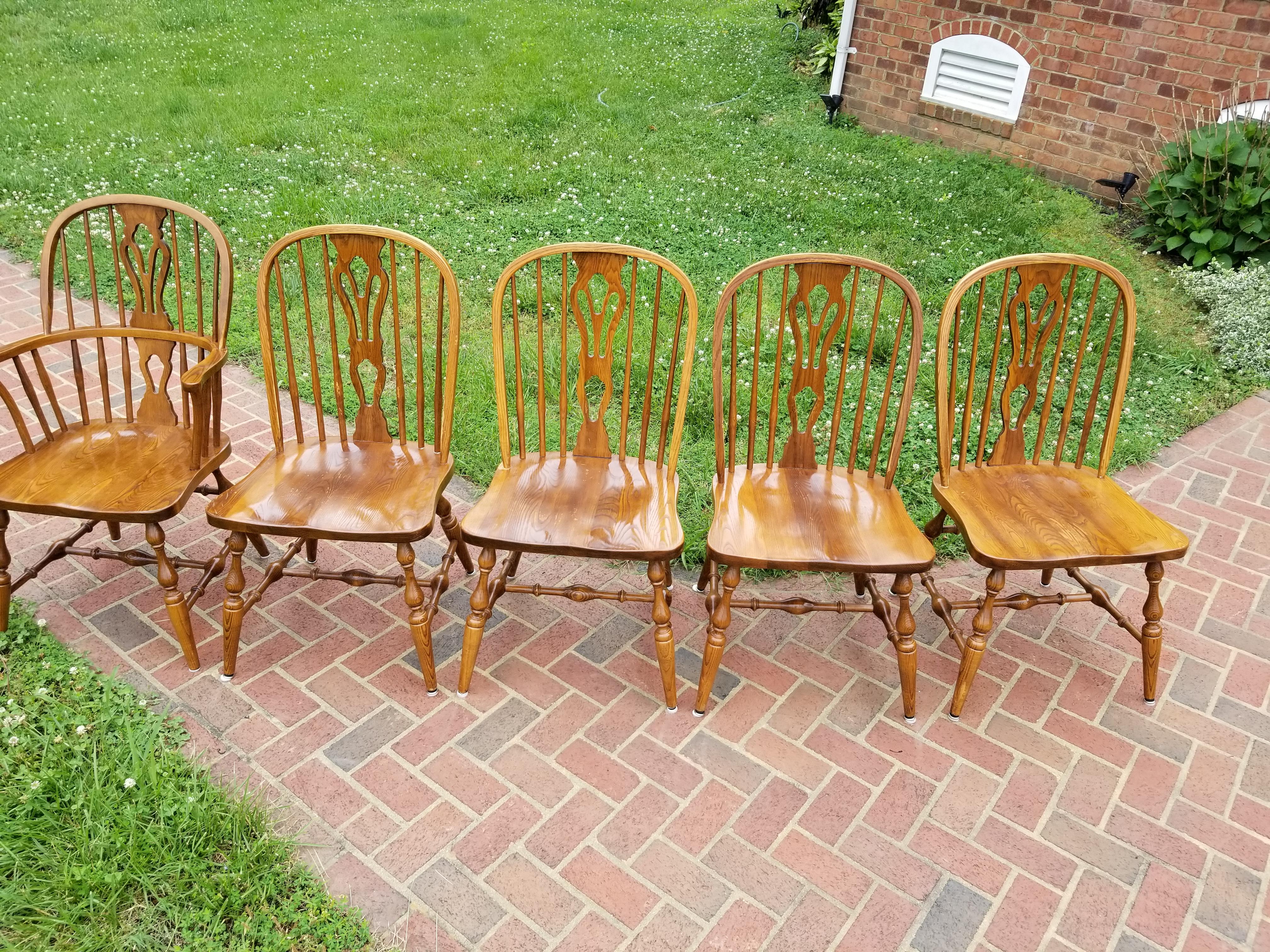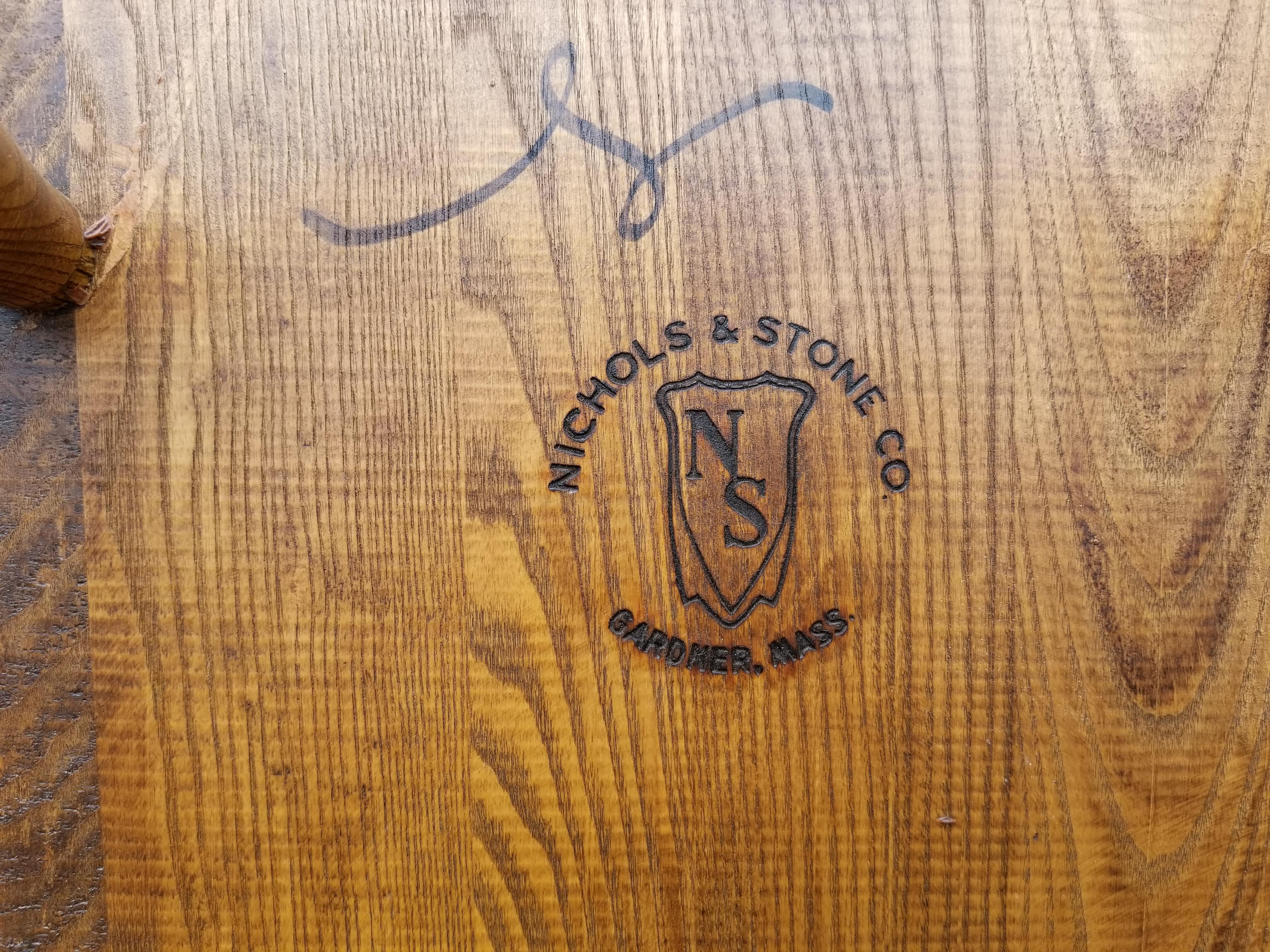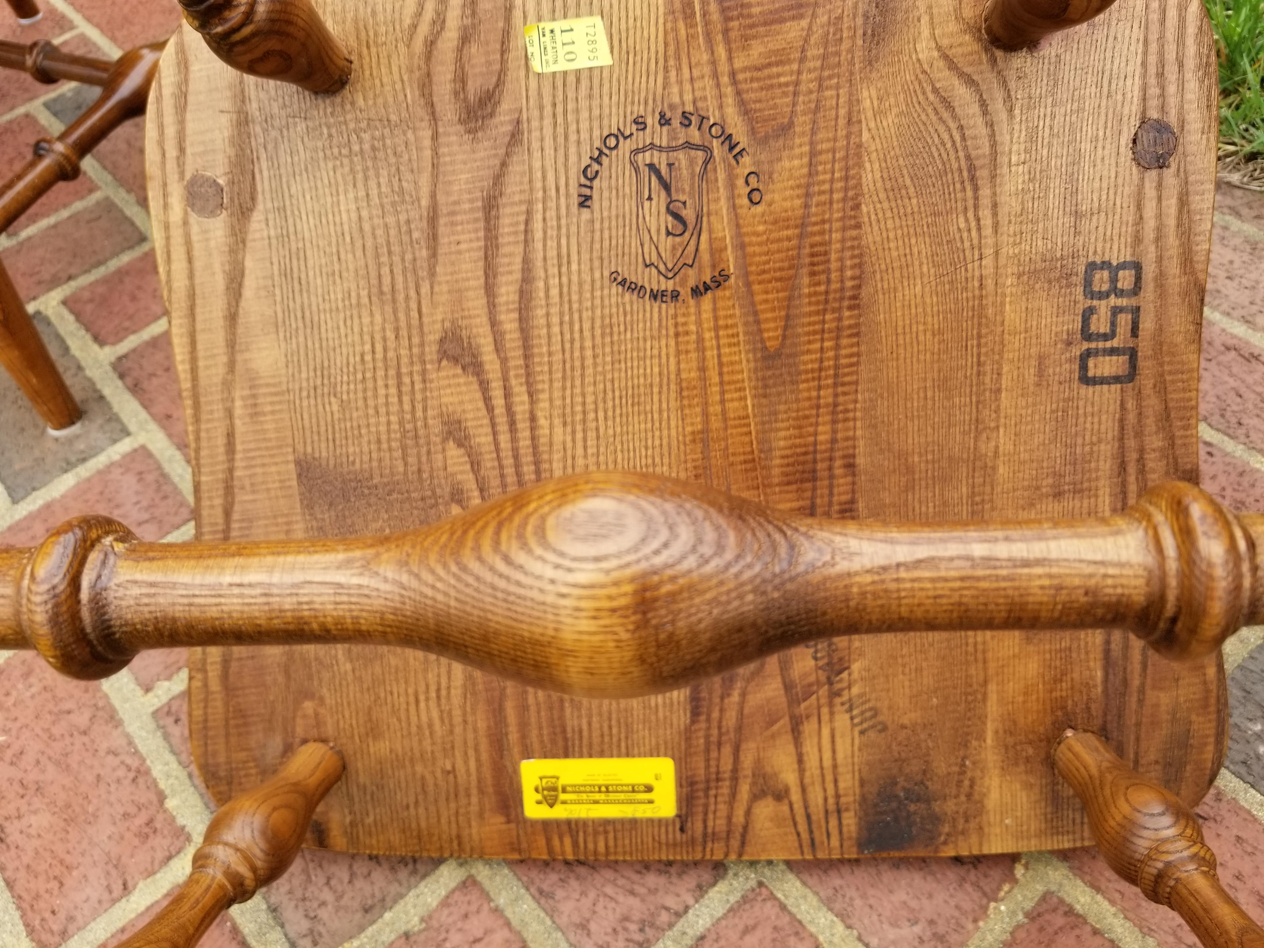 Set of 5 Nichols & Stone bow back dining chairs with decorative backsplat (not sure what this style is called exactly.) One is a captains armchair. I believe they are oak. The chairs are stamped, numbered and signed on the bottom by Nichols and Stone, Gardner Mass and have the numbers 850 stamped on them as well. Date stamp 1983. The legs are turned. The sticker on the bottom is yellow and says Home of Windsor.