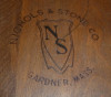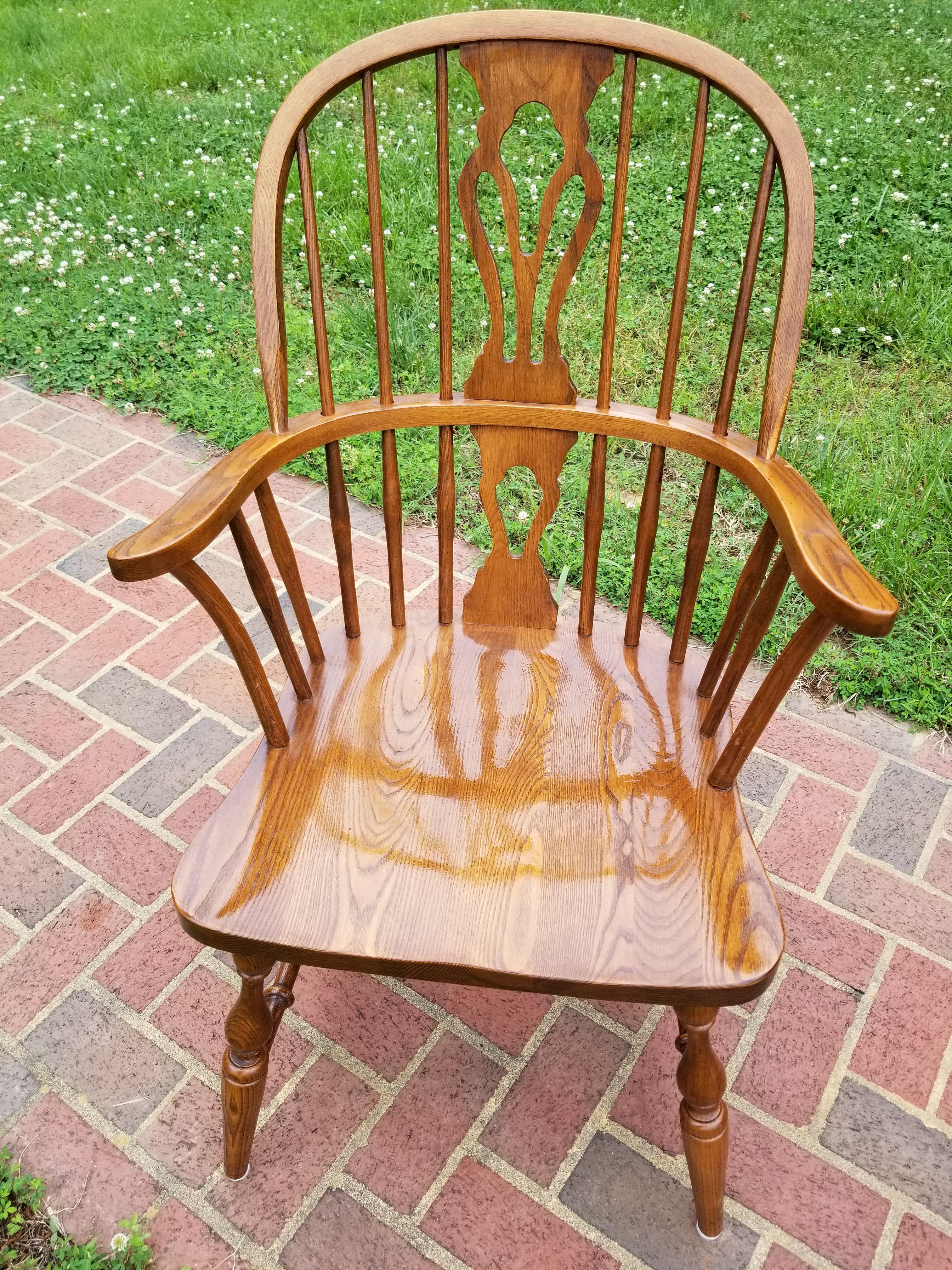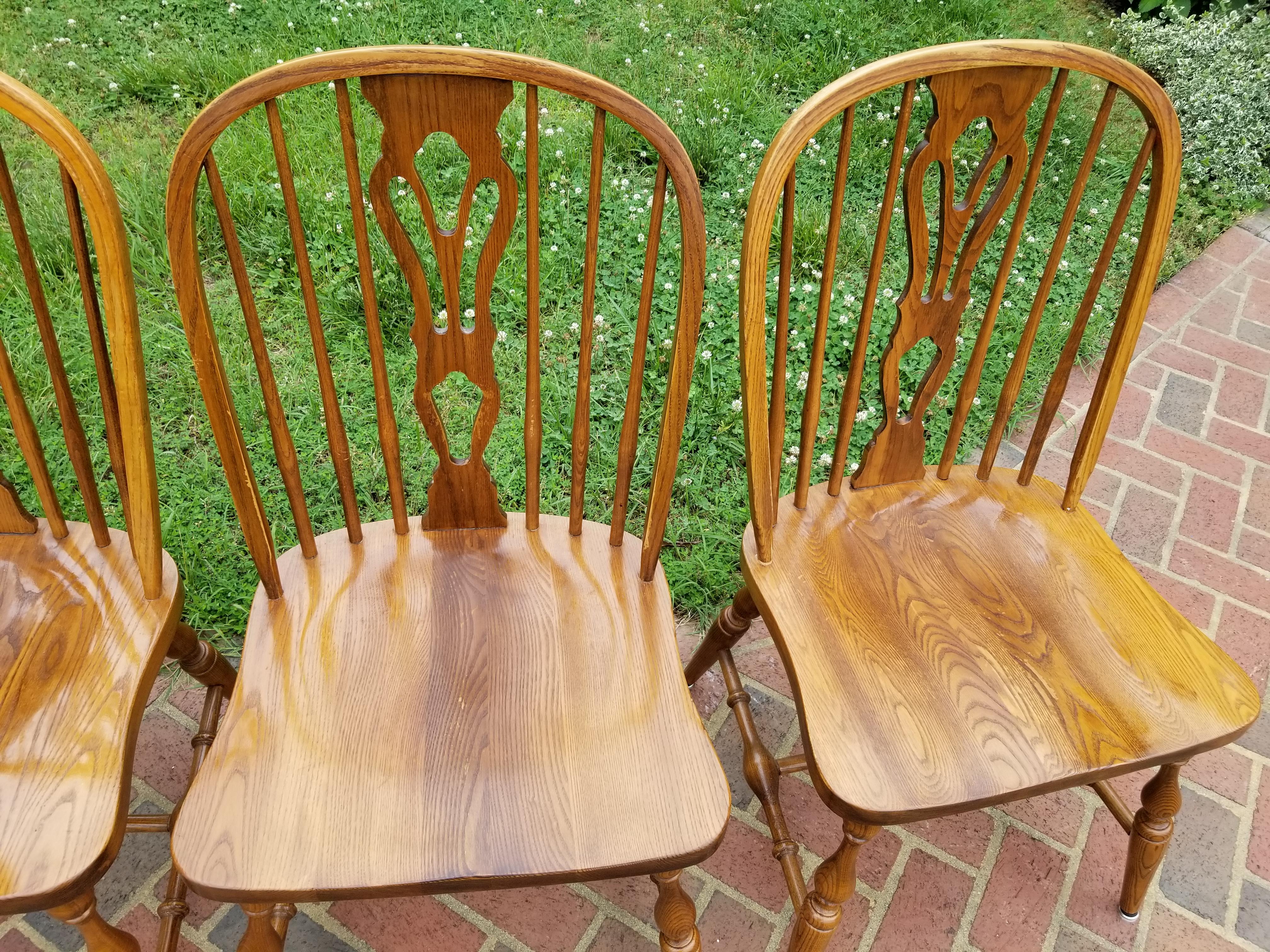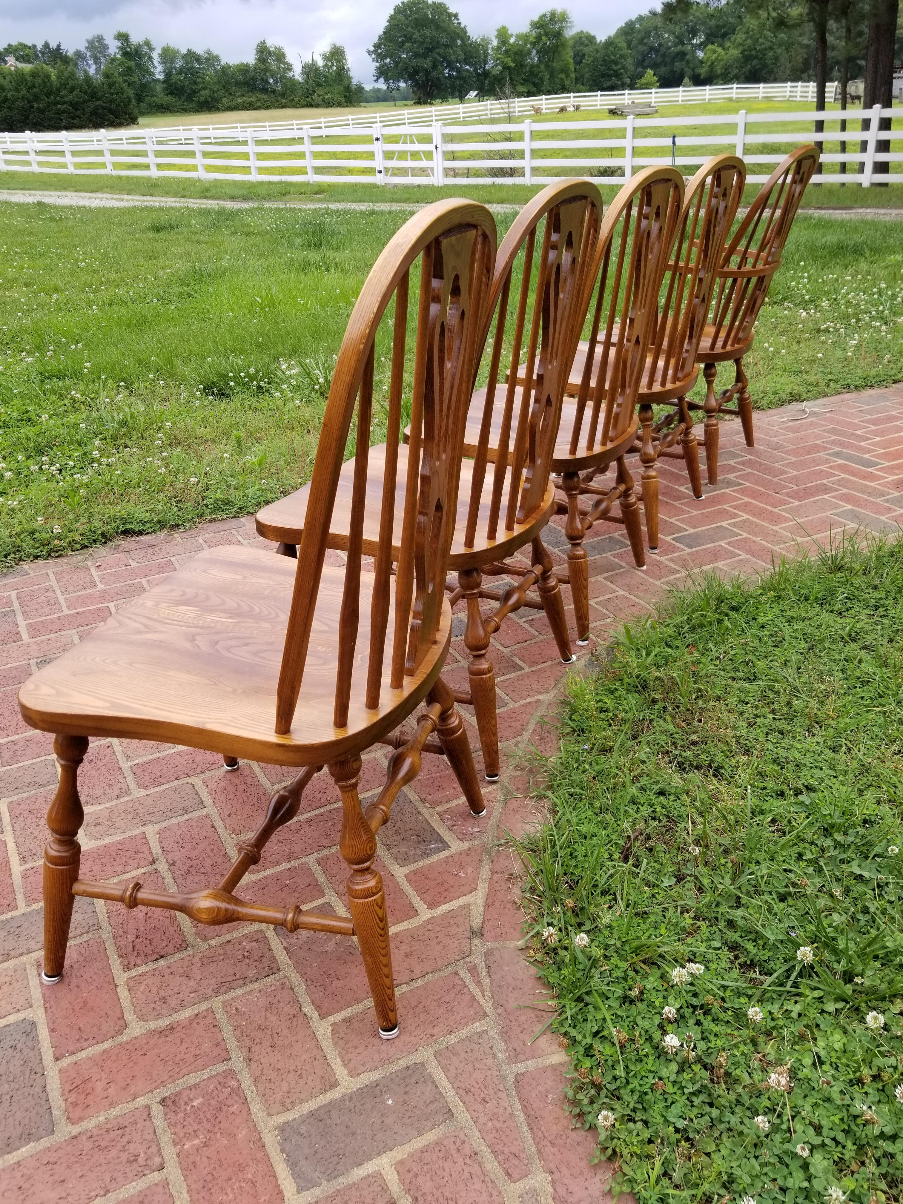 Set of 5 Nichols & Stone bow back dining chairs with decorative backsplat (not sure what this style is called exactly.) One is a captains armchair. I believe they are oak. The chairs are stamped, numbered and signed on the bottom by Nichols and Stone, Gardner Mass and have the numbers 850 stamped on them as well. Date stamp 1983. The legs are turned. The sticker on the bottom is yellow and says Home of Windsor.