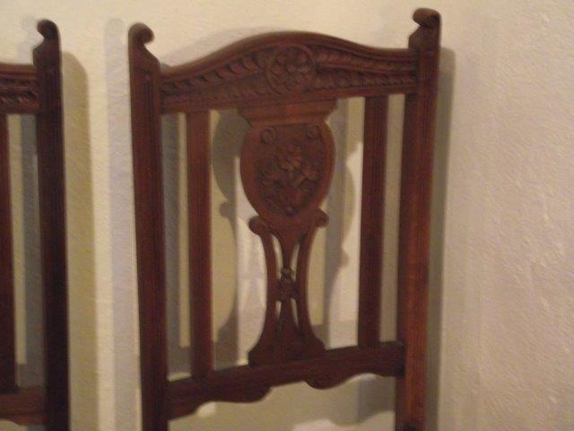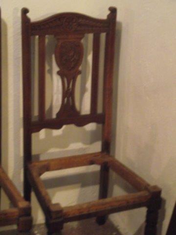 These are a set of 6 chairs that my parents purchased in Yorkshire England in the early 1970s. They came with horribly abused upholstery, so they stripped them of it, then never bothered to get them recovered. They carted them around for years and then passed them along to me when they got divorced. I haven't had a chance to cover them either, as I've never realy had a place to put them if they were covered. And now, my dining room cannot accomodate them. I think they're lovely, but I just don't have a spot for them so I'd really like to sell them. I don't know much about them at all. My father, who knew antiques, has passed away. So I wish I could provide more details, but I can't. Hopefully the pictures will speak for them.