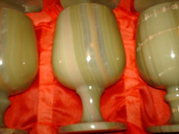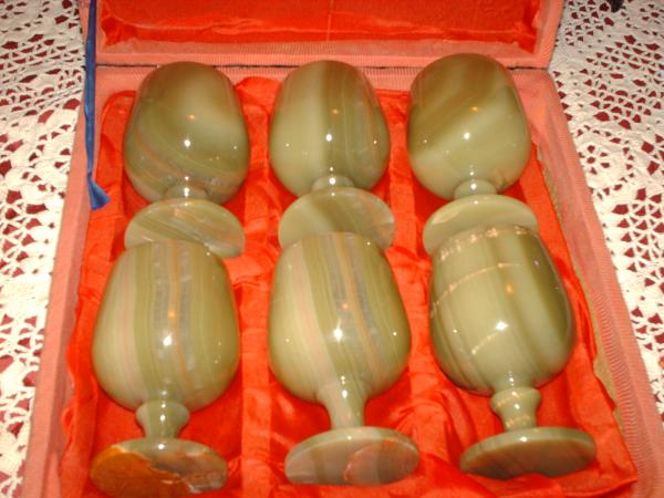 nobody at the yard sale knew anything about these. it is a complete set of 6 goblets. i am sure they are real jade. the box they are in has a faded red silk lining with metal closures. the outside of the box is a faded red thin material. On the back of the box is all in Chinese so i am stumped there. the glasses are very smooth to touch and have a cold feeling to them. There are no lines or rough spots anywhere on them very perfectly shaped with no markings of any kind.