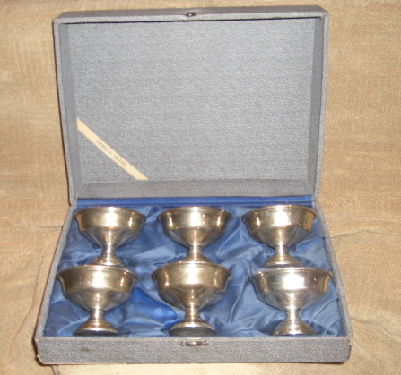 This is a set of 6 compote dishes(?) in excellent, uncleaned condition, in original box. The markings on the bottom of the base are R B (each inside a small "square) and the number 501 or 509. They are marked "sterling reinforced with cement". Age unknown. Not ornate. Thank you so much for any assistance. I don't use twitter so if you would like to contact me, I would appreciate your help at [email protected].