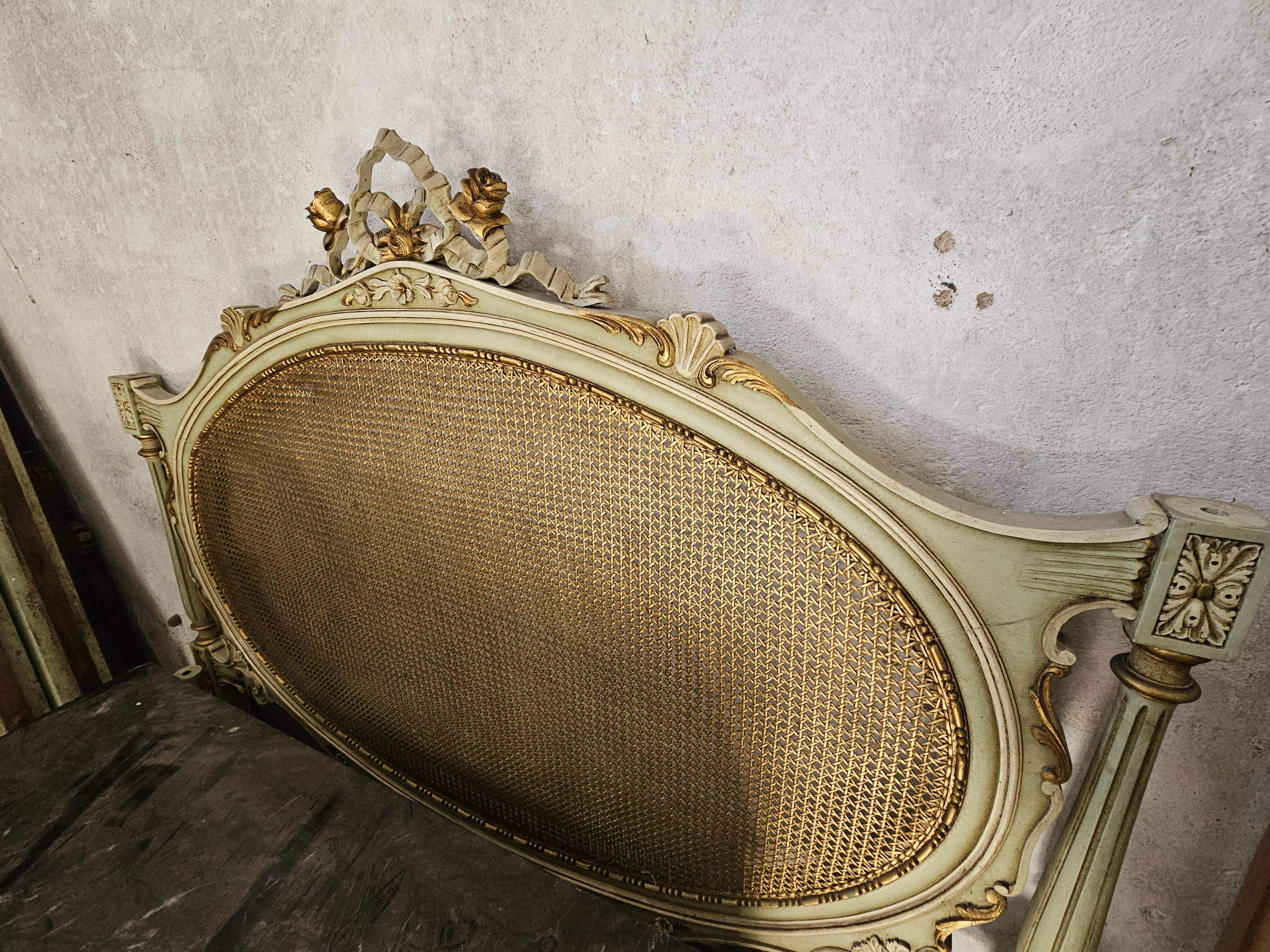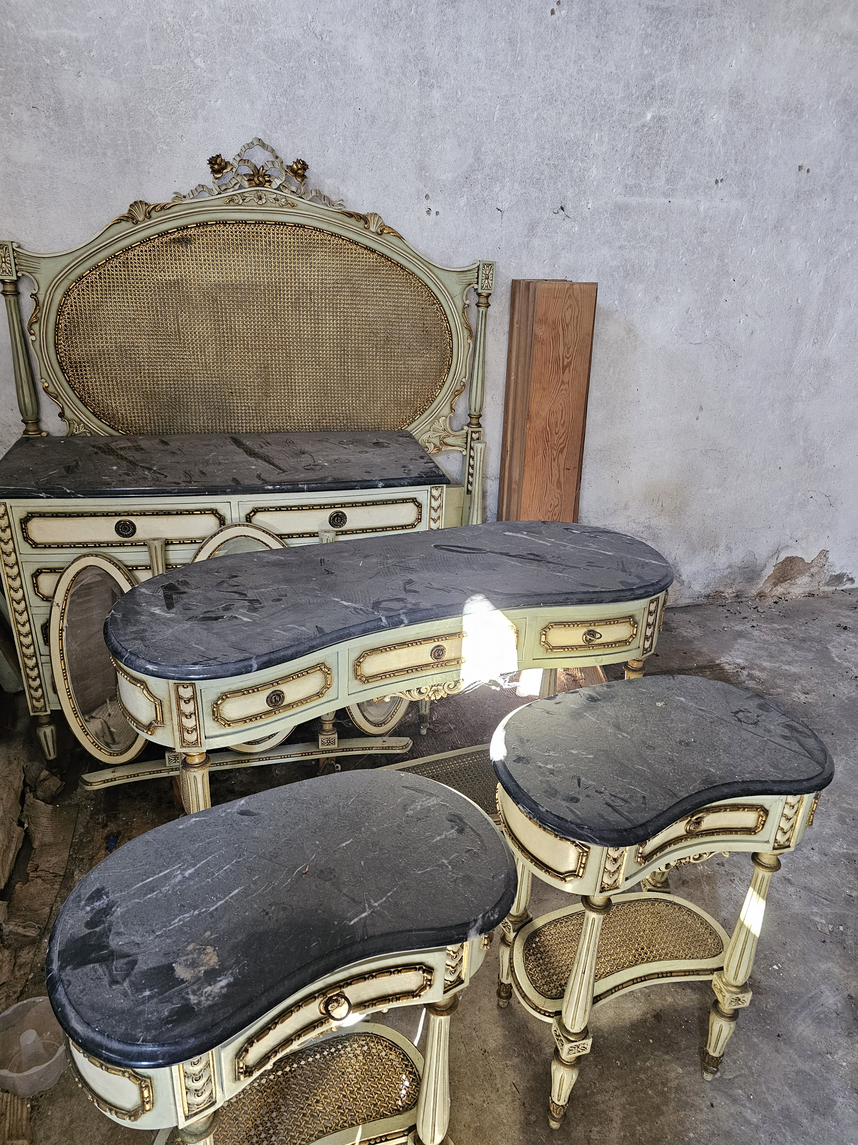 Physical Description: This set includes a double bed, two bedside tables, a demilune table, and a chest of drawers. The furniture is primarily constructed from wood, featuring a cane backrest on the bed and decorative elements in a pale green and gold finish. The dimensions of the bed are approximately 190 cm in length and 120 cm in width. The tables have an elegant kidney shape with black marble tops and cane detailing on the sides.